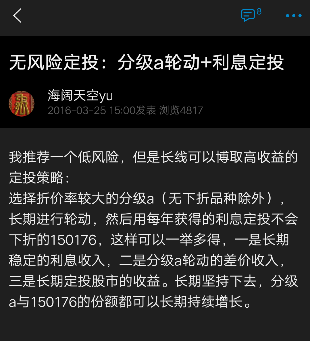 上面这篇帖子是我在2016年3月20日发的,当时并不知道分级a会被终止运行,现在大家都知道,分级基金在2020年底已经全部转型为LOF基金了,后来经常有朋友问,现在没有分级a基金了,这个《可转债与分级a的“跷跷板” 复式轮动模式》是不是已经失效了?