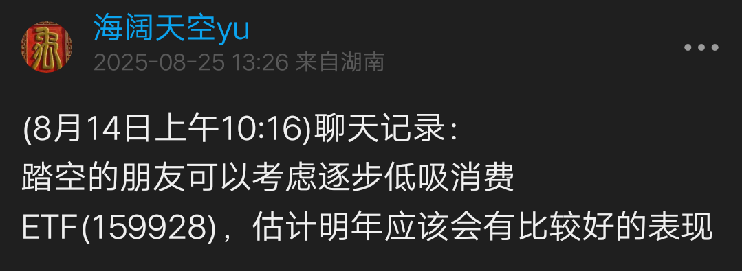 (8月14日上午10:16)聊天记录:踏空的朋友可以考虑逐步低吸消费ETF(159928),估计明年应该会有比较好的表现