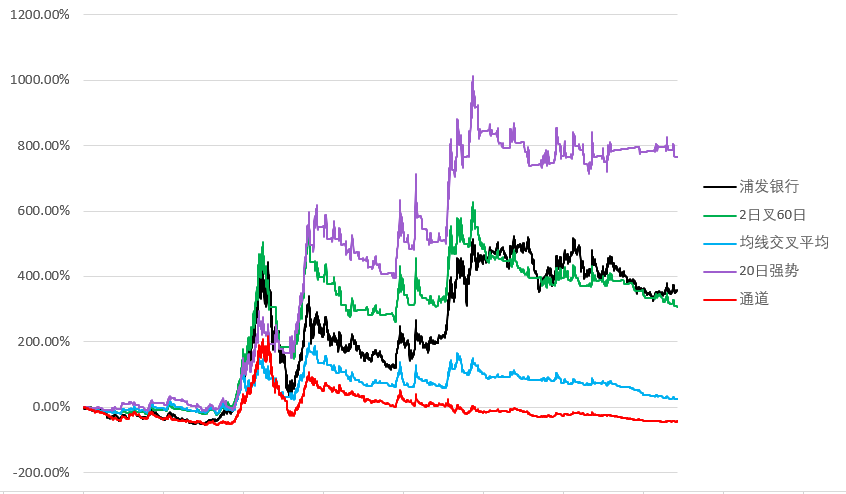 个股我测过几只,虽然个股之中表现差异很大,但有一点可以确定的是这个策略在个股上表现依然明显优于均线、通道类。A股的个股大数情况不具备动量效应,所以即使用这个策略长期也很可能是负阿尔法的,用均线通道的就不必说了,绝对的负。个股中市值大的个股比市值小的个股的动量效应明显,这可能就是浦发银行表现好的原因。