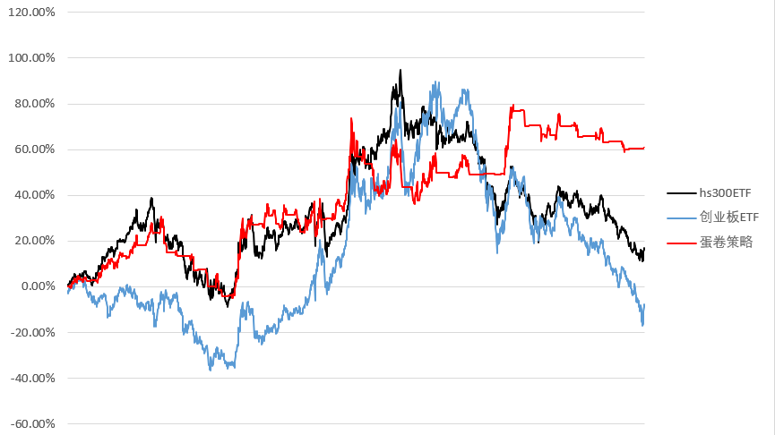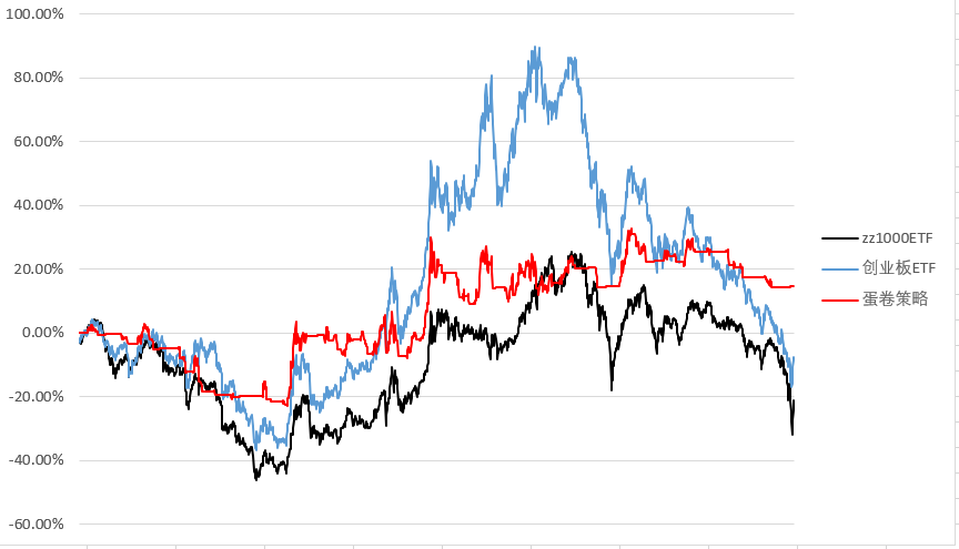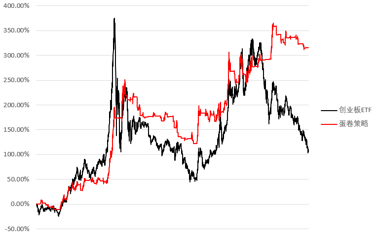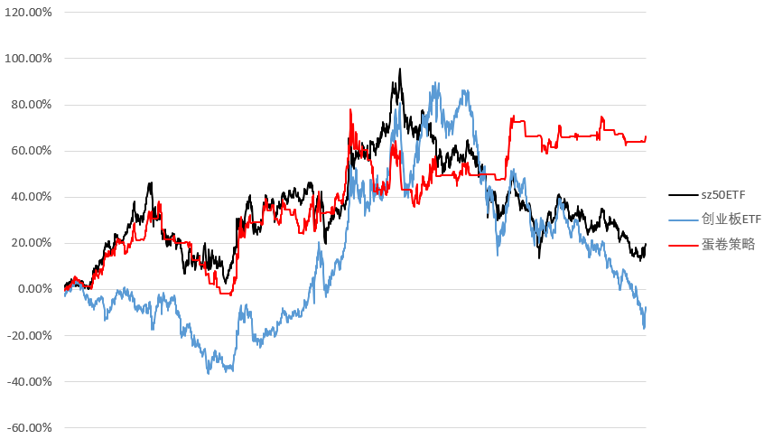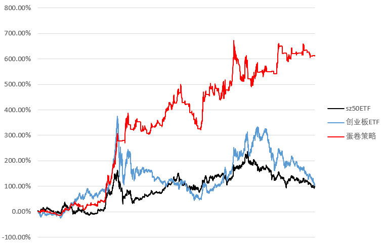 这个明显比单吊一只ETF好了不少。2011年创业板ETF成立以来,与sz50的蛋卷轮动在本粗陋的模型里年化是17.7%,最大回撤为29%