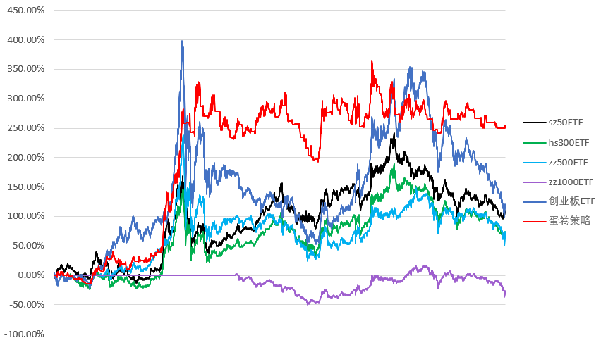 最近清仓的那几天又研究了一下这个模型,我始终认为趋势策略风险是最小的,但趋势在A股很难做。对比了几个日线级别的趋势系统:均线交叉、macd、海龟法则,还有这个……就称为蛋卷吧,当年二八轮动也是称为蛋卷的。有下面几个发现:一、从单个标的回测来看,蛋卷收益一骑绝尘,同样是趋势型,我搞不懂为什么蛋卷明显优优优于其他趋势交易法,无论对ETF还是对个股来说都是这样。我仔细检查过代码,确认没有用到未来数据。...新年快乐!祝龙年行大运,投资顺利!