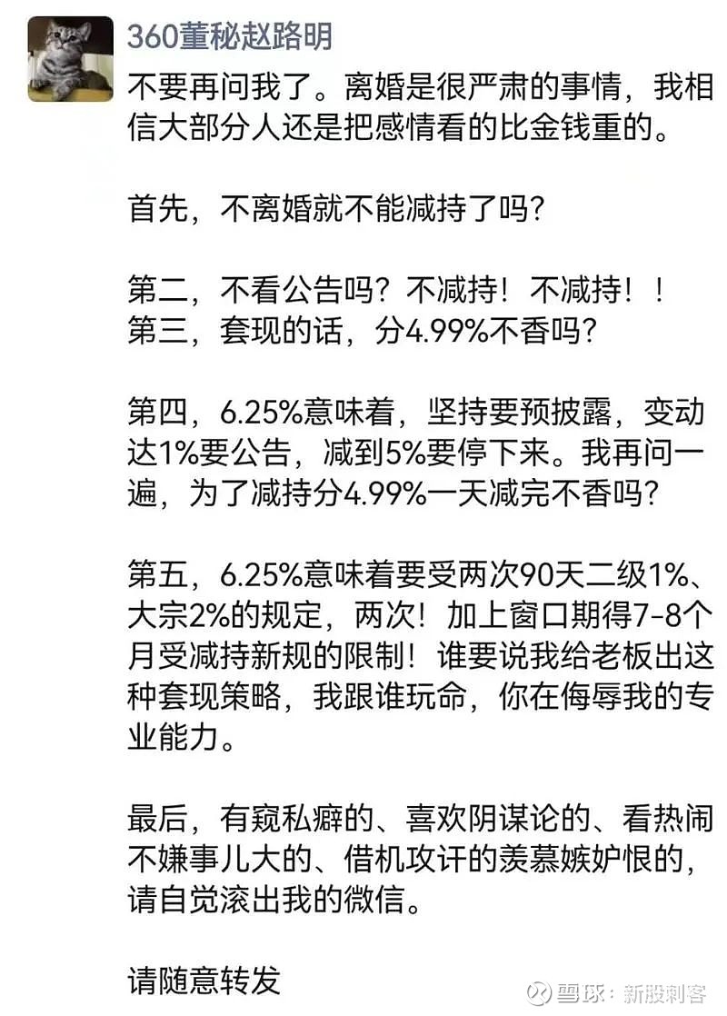 回到A股三六零上,要是想减持,那就公告减持,然后明年再公告减持,和现在拟12个月不减持差不了多少感觉