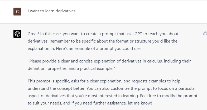 2. 实际试用演示的Teach function之后我的感受是老师中用于传授知识的那部分可以全部淘汰了,以后老师的作用应该是仅仅剩下人类直接互动的那部分,例如监督和陪伴。比如,我可以让GPT教我Prompt Engineering。例如,试用Teach(GPT Prompt Engineering), 在一段概括性的对话后,ChatGPT让我