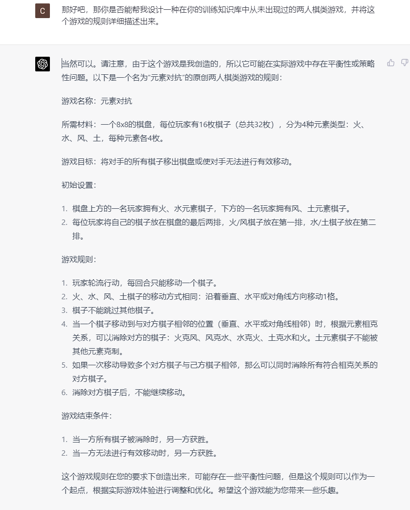 最后,关于下棋的例子,其实你们可以首先看看SudoLang这篇文章,再看看我在文中贴出的图片你就知道GPT是不是所谓的Google++之类的东西。然后,我们来试试GPT 4.0对于我说的这句话,你们的反驳会如何作答,另外,我会让它帮我设计一个“从未存在过的”棋类游戏: