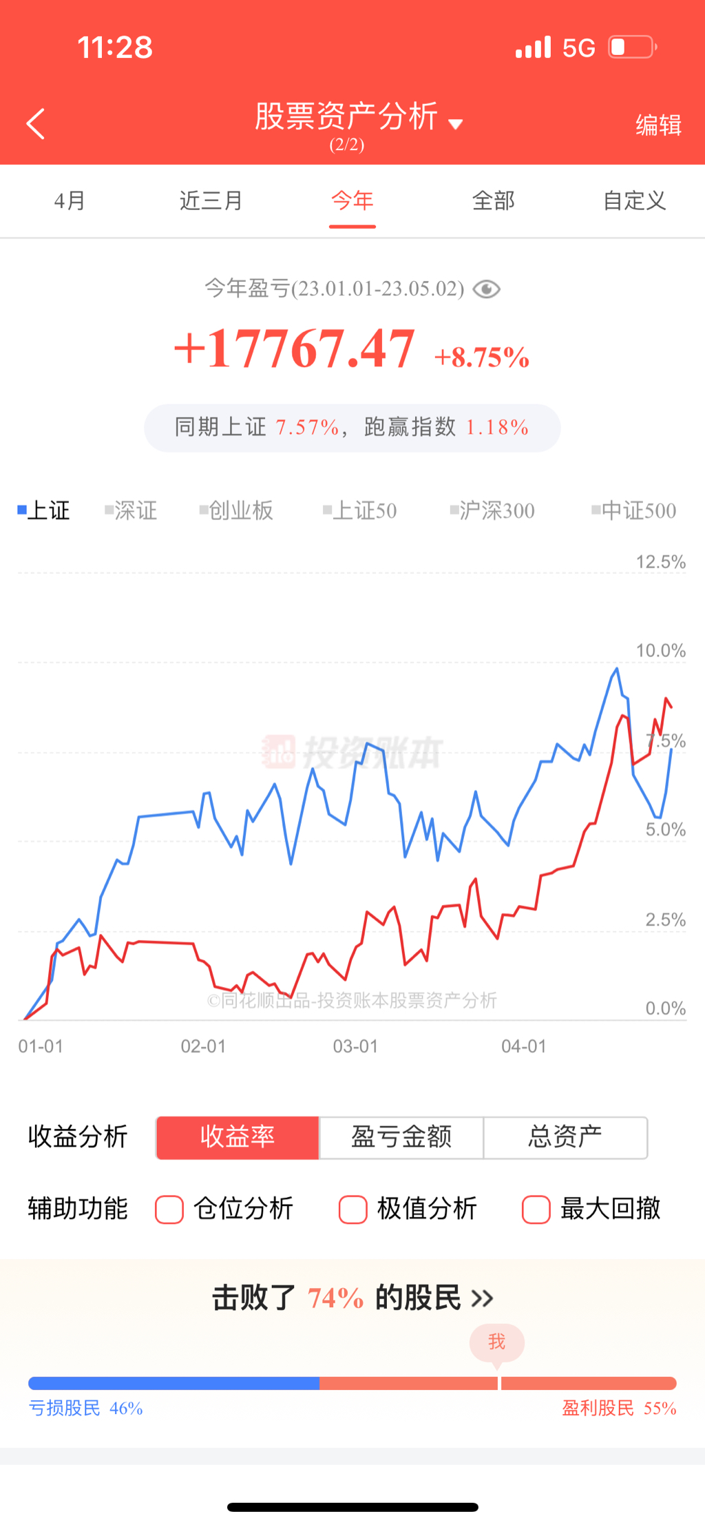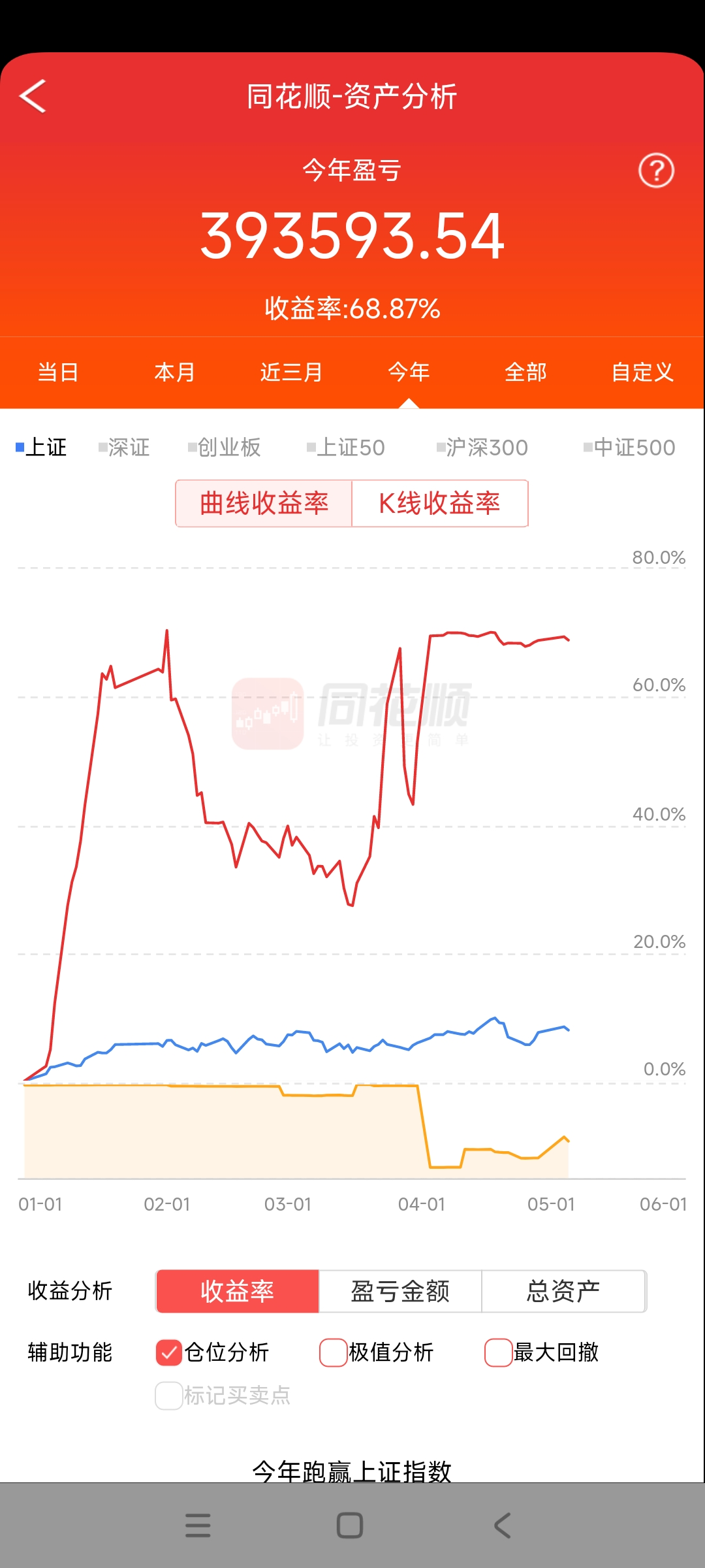 这两年比较忙,股票也没怎么操作。。半仓财富趋势拿到现在,四月中旬止盈,虽然拿了翻倍,但是前面成本买的高,去年跌70万,今年1月涨70万。。