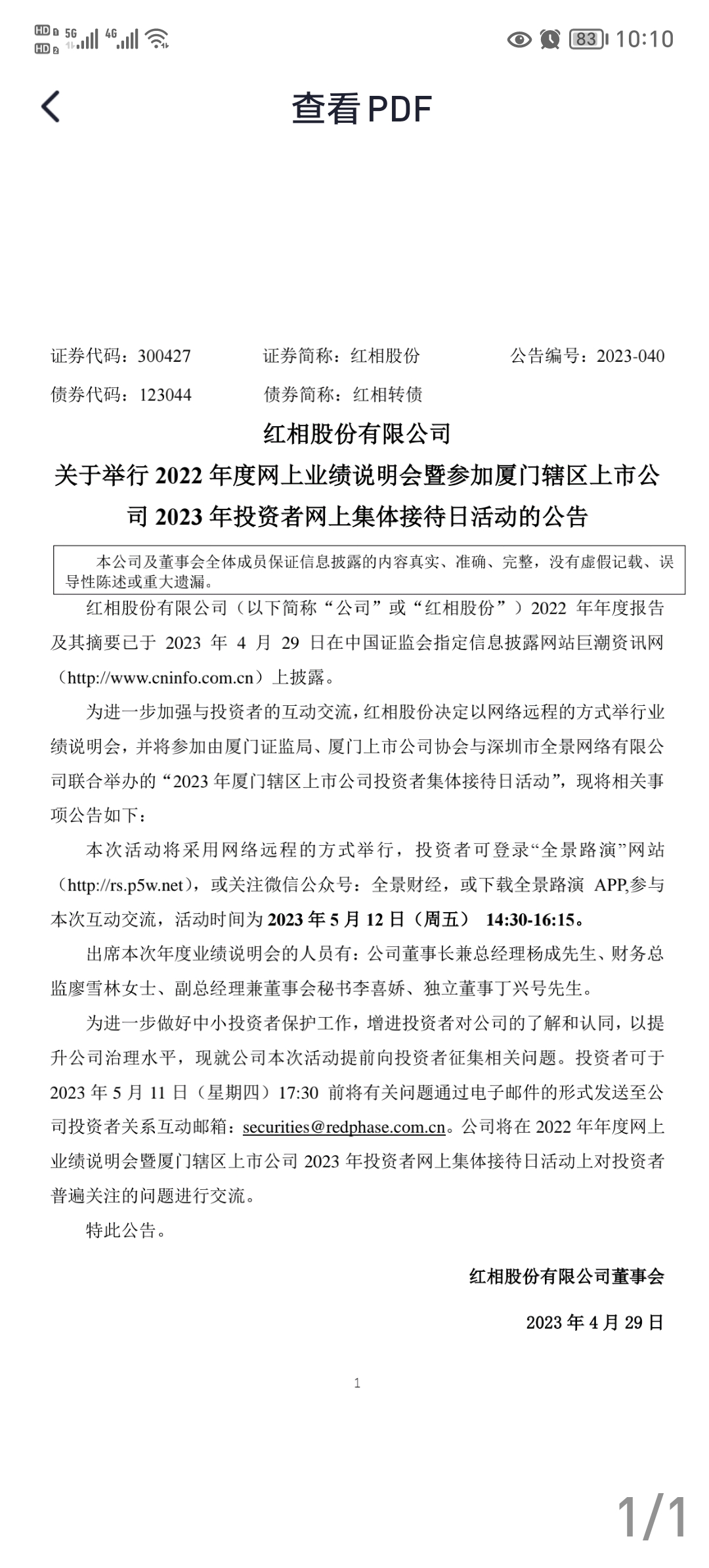 与接近监管相关人士刚讨论过,红相可能属于监管认定涉嫌虚假陈述特别严重的情况,监管极其愤怒,所以才会这么快立案,将会对公司的历史报表从严重新审计,后续视情况从重处罚与市场禁入,可能极大可能触及重大违法违规的其他退市情形。我持有少量红相转债,已提前挂单跌停板(-30%)卖出,希望能侥幸顺利卖出,巨亏也比一无所有好,祝大家好运,自求多福你这牛B吹的,小心闪了舌头,