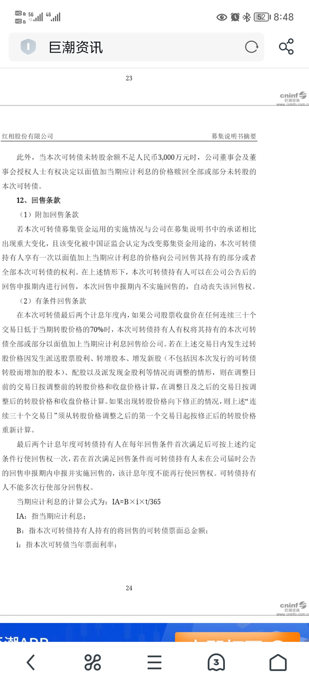 与接近监管相关人士刚讨论过,红相可能属于监管认定涉嫌虚假陈述特别严重的情况,监管极其愤怒,所以才会这么快立案,将会对公司的历史报表从严重新审计,后续视情况从重处罚与市场禁入,可能极大可能触及重大违法违规的其他退市情形。我持有少量红相转债,已提前挂单跌停板(-30%)卖出,希望能侥幸顺利卖出,巨亏也比一无所有好,祝大家好运,自求多福可不可以要求红相立刻偿还转债?
