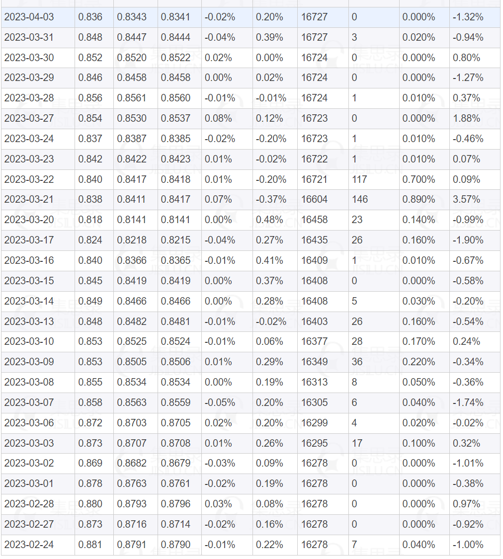 2023-04-28 0.806 0.8018 0.8016 -0.02% 0.52% 17353 131 0.760% -0.29%