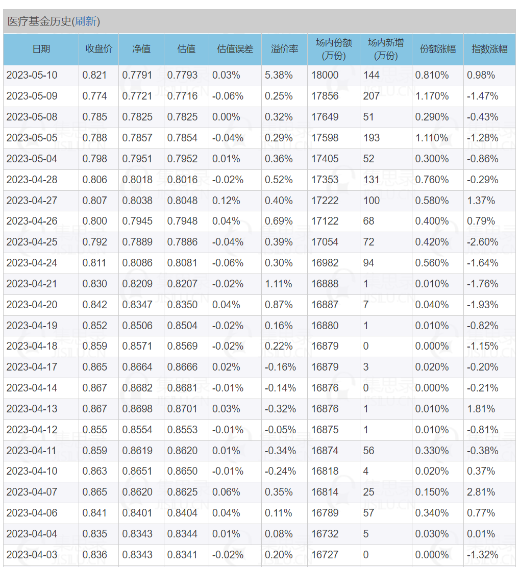 日期 收盘价 净值 估值 估值误差 溢价率 场内份额