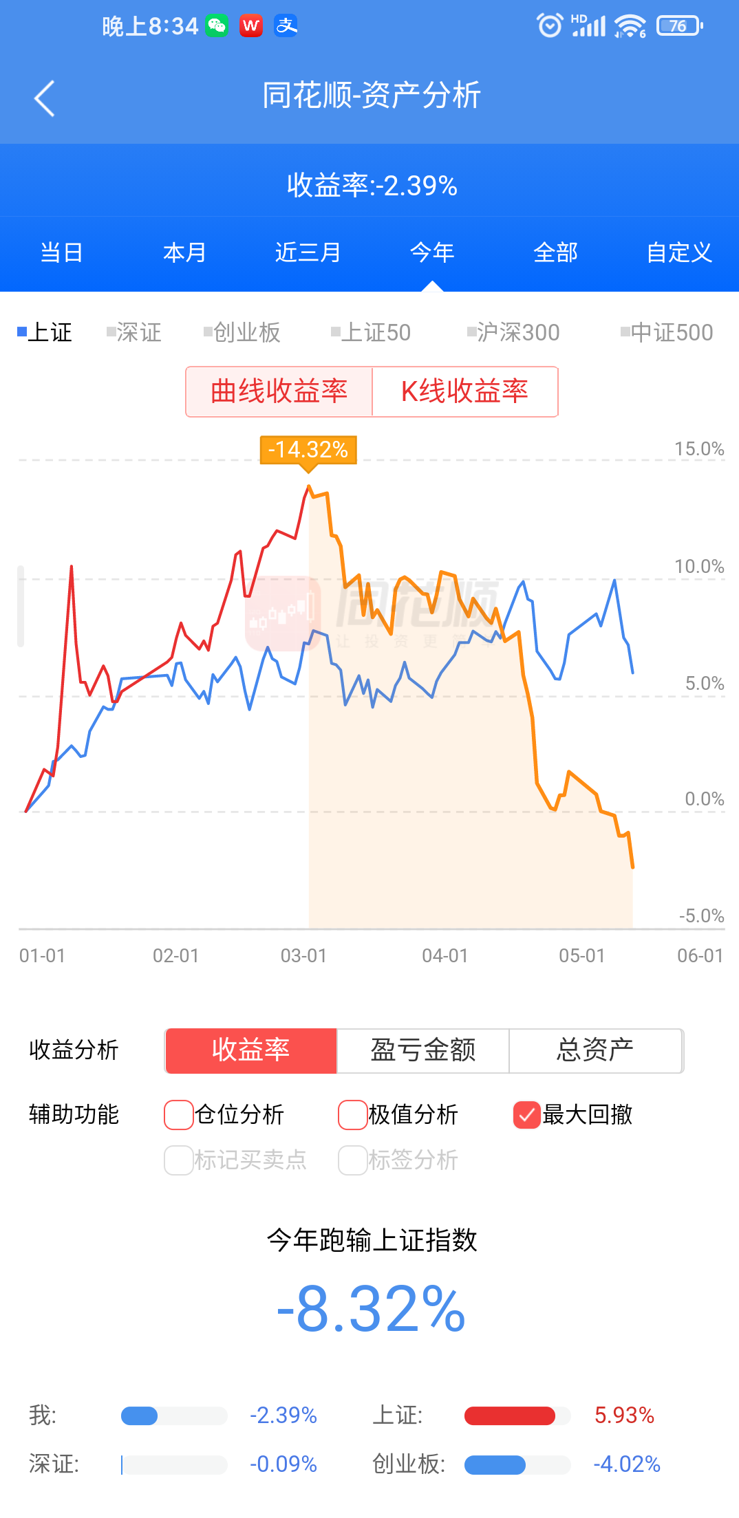 4月至今,回撤了20个点了,整个人都快郁闷了,迷茫了,不知道前路在何方。重点是没有自信了,从来没有的感觉。一直满仓。