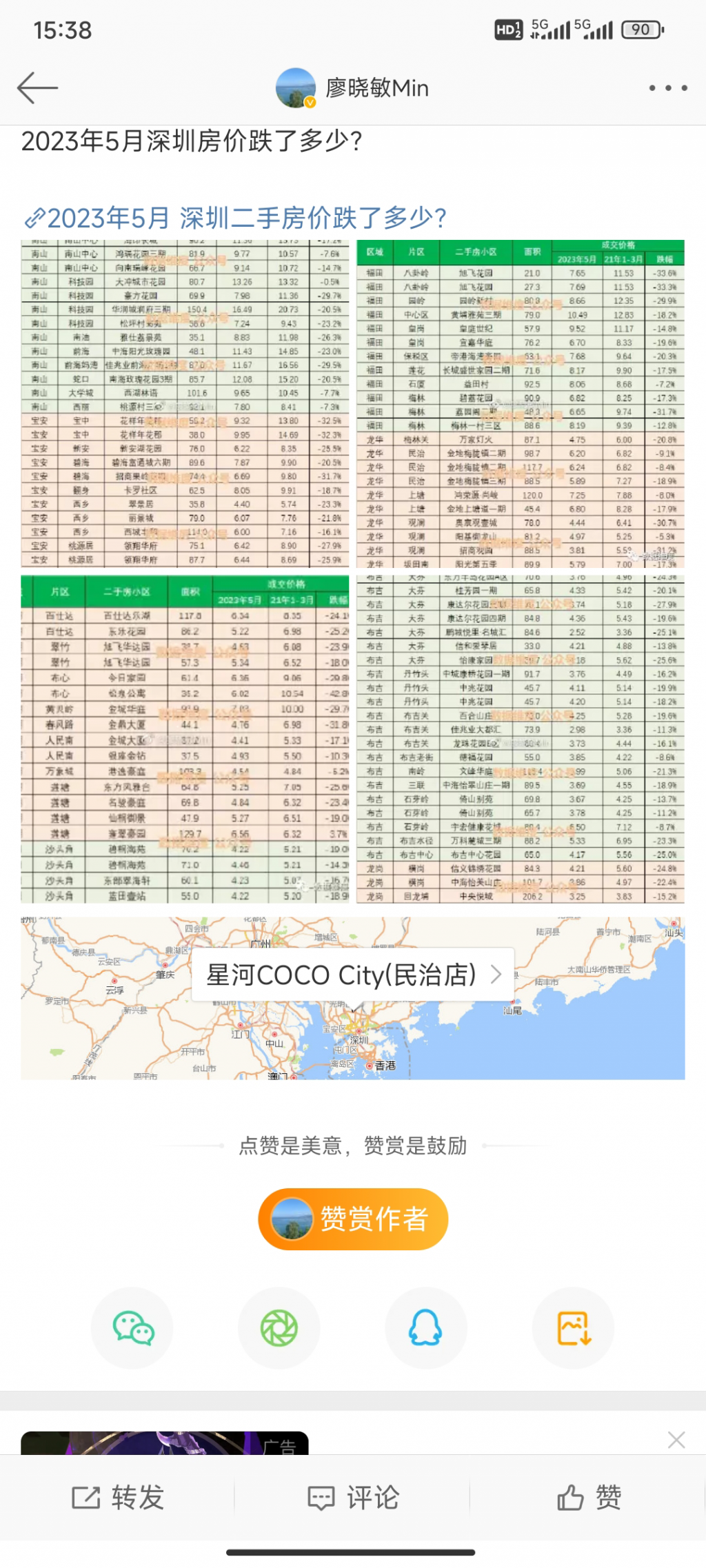 但凡关注几个中介都不会说深圳没怎么跌了。数据跟21年初比较的,平均25%,跌的最惨的是学区房,前海之类的,腰斩。当然,也有涨的呢,像香蜜湖啊,红树湾啊,恒裕啊什么的,不过这些房子跟普通人有关系吗?这才叫求实精神,很多人只凭自己的感受甚至瞎猜、瞎说...................