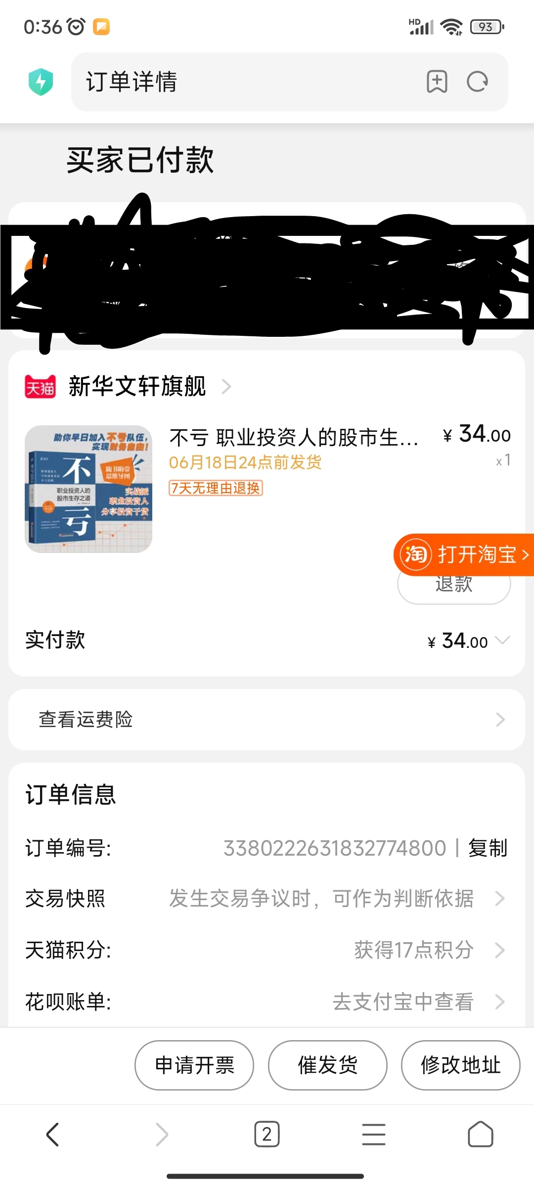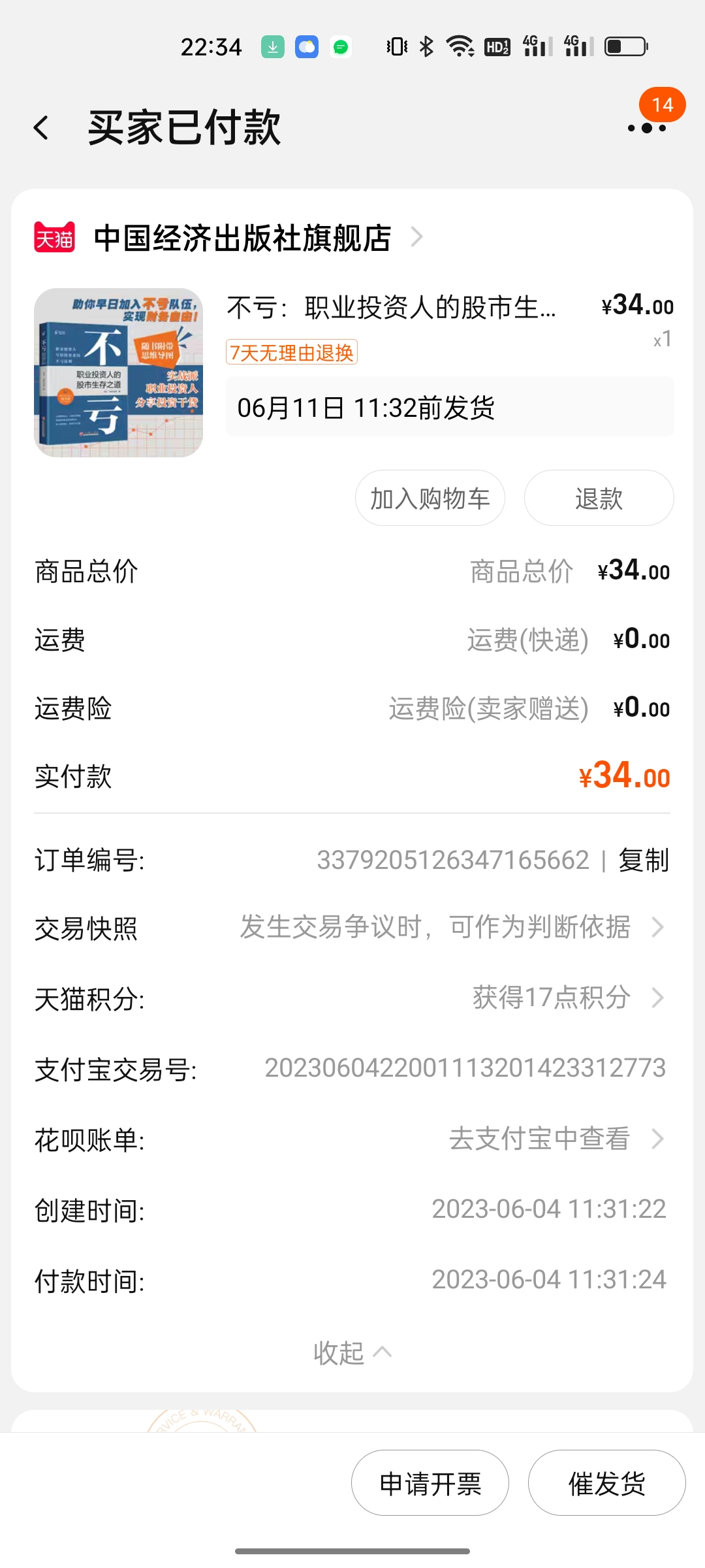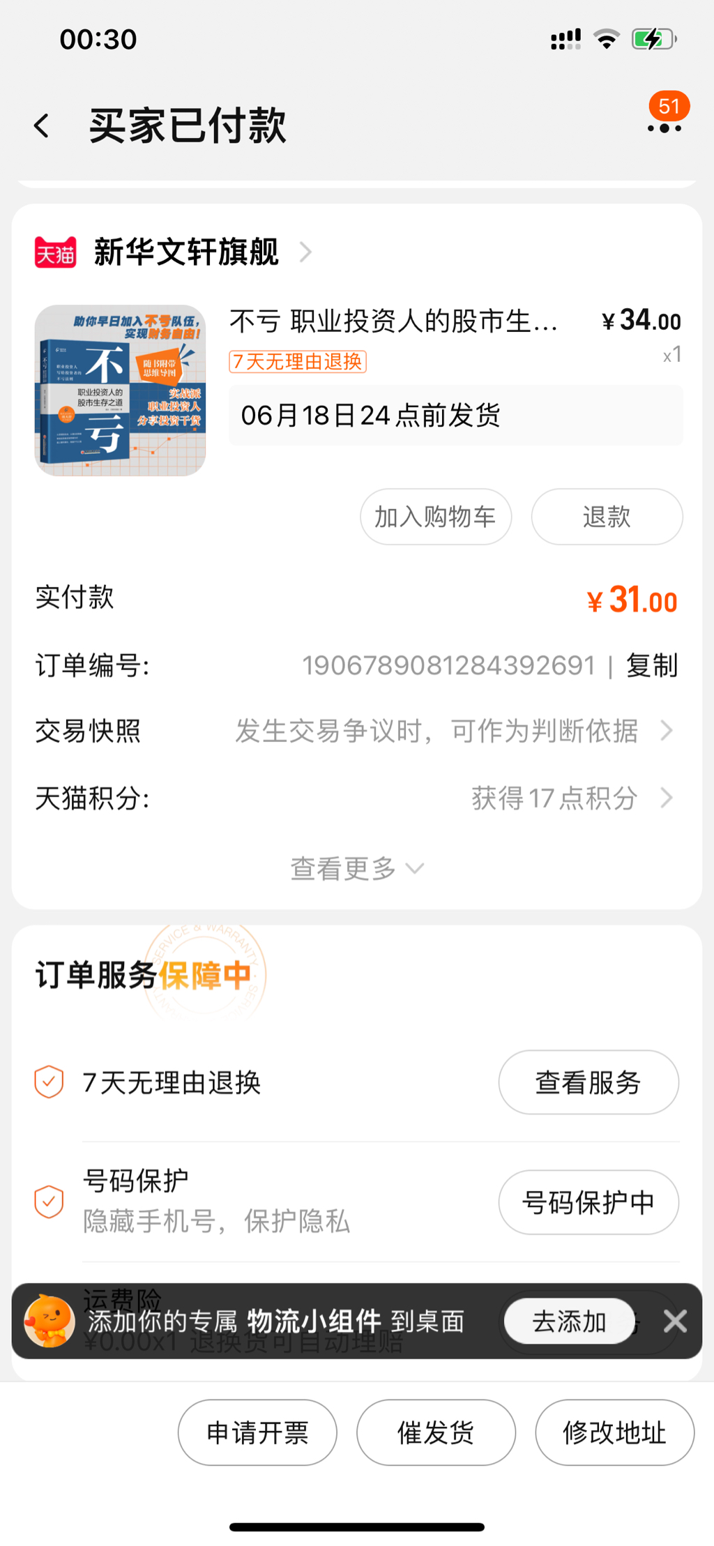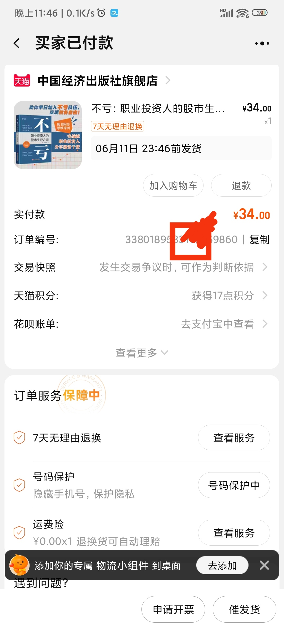您可以提醒卖家发货(付款24小时后)备忘申请开票
