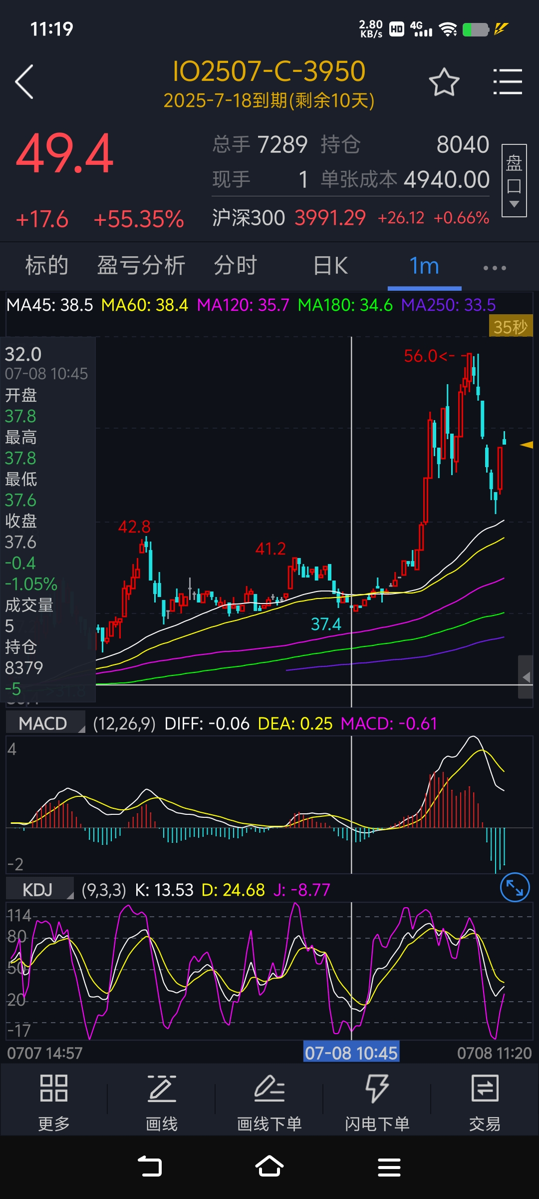 昨天尾盘38.8元买了一张上证50股指期权2750购,今天低开30.2亏860元,后来挂单41.6元走的。待到10点时候看着上证50一分钟有突破形态赶紧46.6元挂单买了进去,后面用50%画线跟踪挂51元走的。今天直到尾盘上证50从开盘涨了3.9%,而2750合约收盘价值9700元,但我根本吃不到这个涨幅,因为波动大拿不住。总结:想博单边自己不是这个料,把握不了这个事情,亏大盈少几率大。