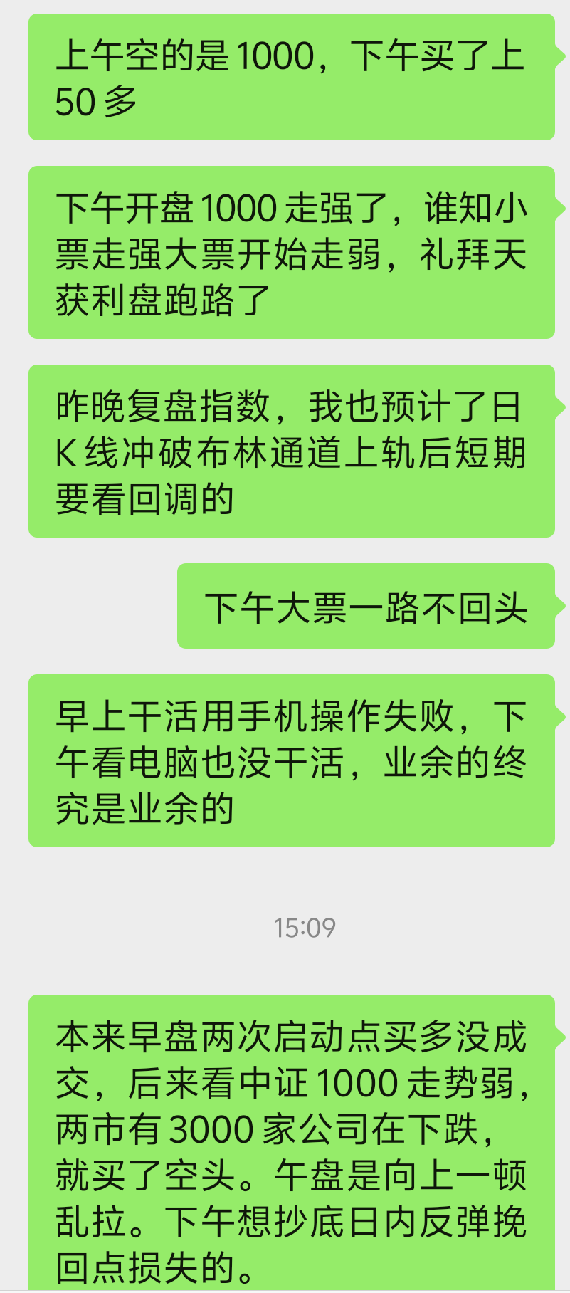 日线大趋势强的时候,日内逆势做空真不行,今天早上盯着原油,高位开空白耗一天亏损,尾盘还靠空中证1000回来大部分。明明大S指数最弱,没选择逢高空指数。