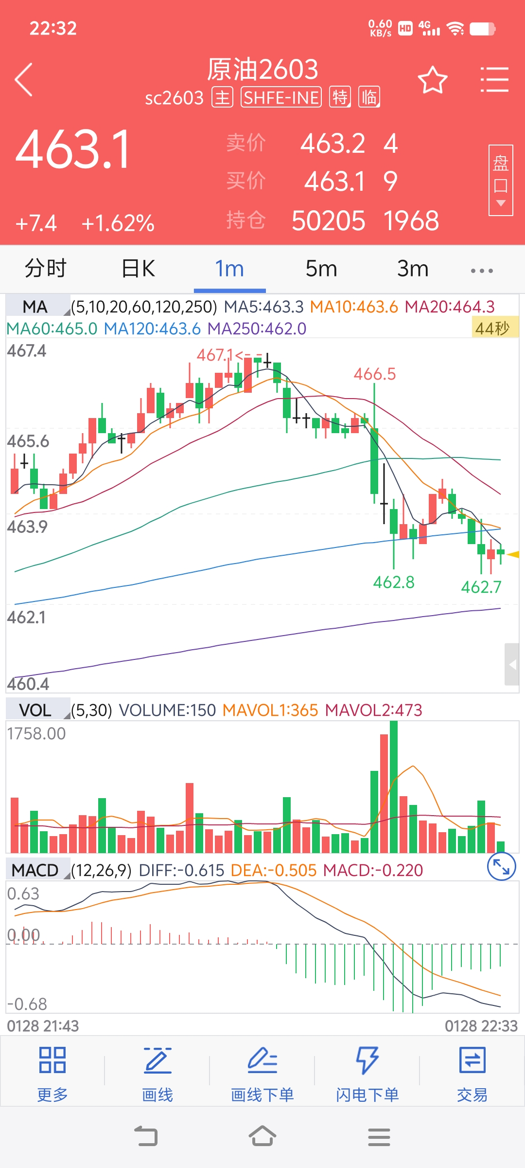 待到10点时候看着上证50一分钟有突破形态赶紧46.6元挂单买了进去,后面用50%画线跟踪挂51元走的。