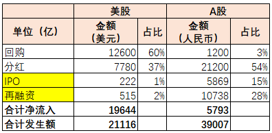 2022年A股和美股年度分红和回购总额,是超过股权融资总额的,都是在流入,看起来是美好的。