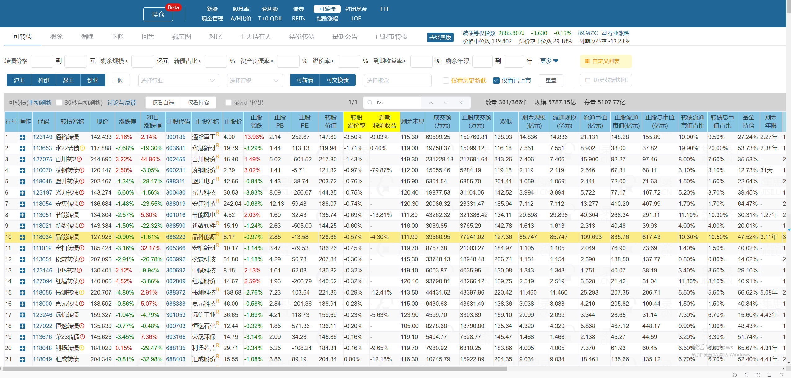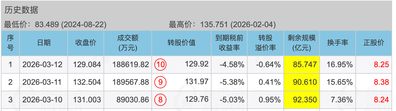 图片中的晶能转债就是近期的转股比较多,详细页里有高亮的黄色显示。