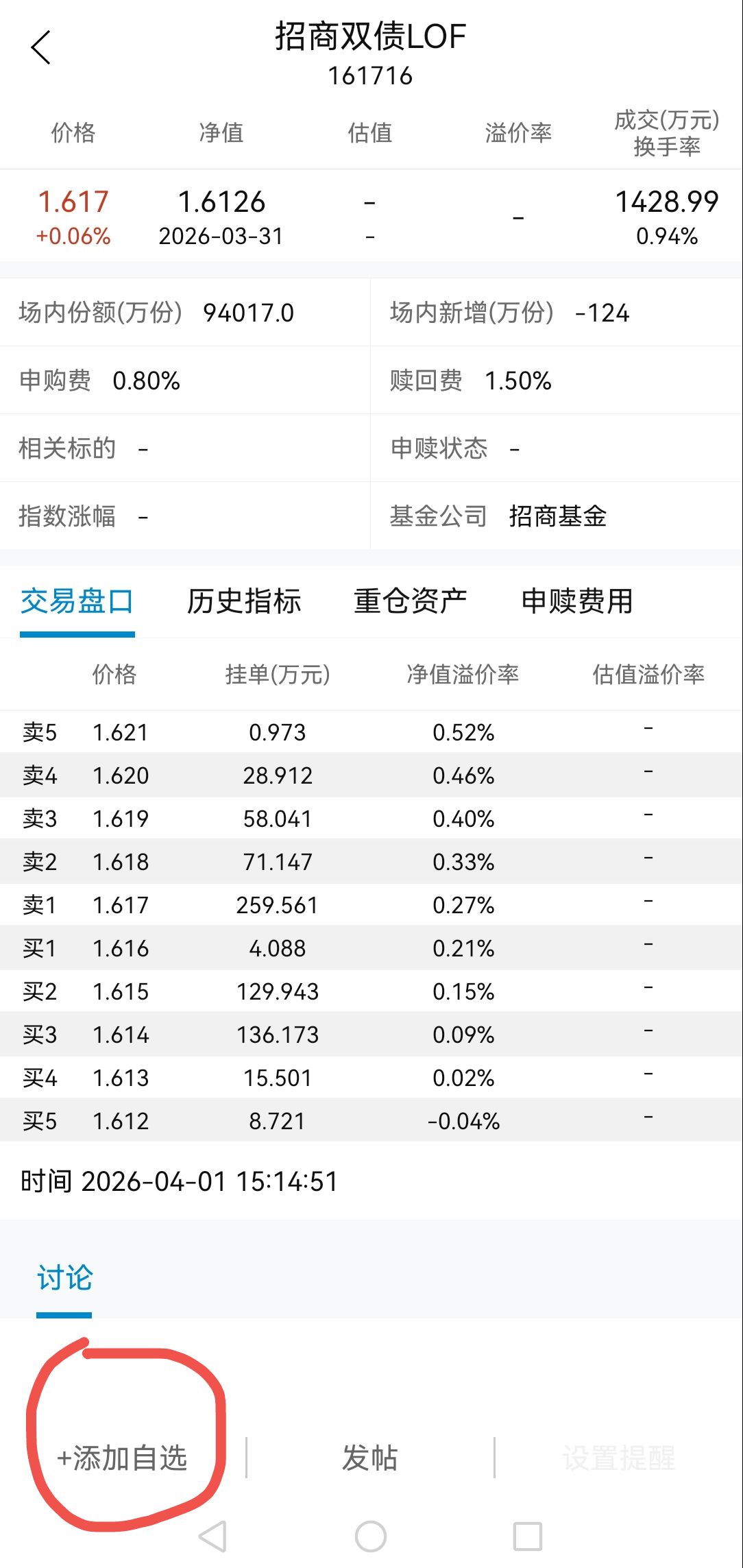 四季老师你好,华为手机,LOF,图片圈的地方,点添加自选/删除自选都没反应,其它栏目的没问题,你有空帮看看
