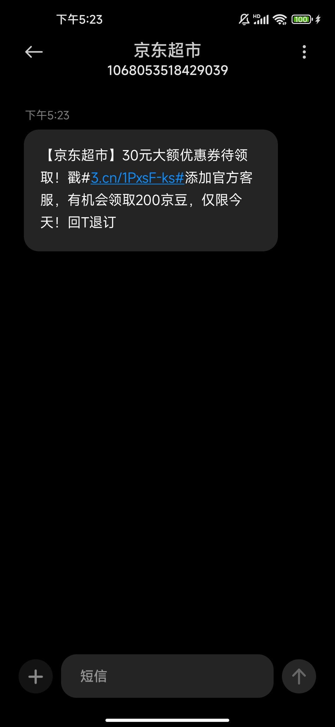 接到了个电话说自己是京东商城,说我是生鲜用户,送30优惠券点链接200京豆,然后多此一举来了句加微信,然后我一看是个上海的个人电话,鸟都没鸟然后来个京东头像的短信