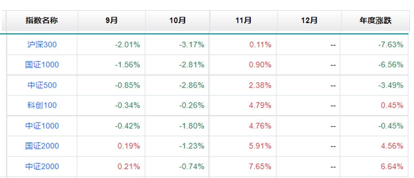 最简单的,最近几个月,微小盘股表现强势。尤其最近的11月份,沪深300只涨了0.11%,但中证2000却涨了7.65%!