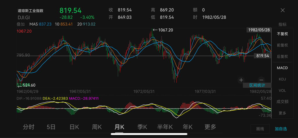 绝望吗,20年的时间里面,最大涨幅连一倍都没有,这就是你们心心念念的道琼斯指数,是巴菲特成功的所谓核心因素。不要把自己没法赚钱轻易归因在外在因素上,这除了给自己一个心理安慰之外,对于自己能力的提升没有任何帮助,也不会因此就使得你扭亏为盈,还徒增笑话你连巴菲特资金体量大幅增长的时间点都搞不清楚,我猜你肯定连价值投资方面的书籍也没看过,也根本不清楚价值投资是怎么一回事。还洋洋得意找一段震荡行情来嘲讽我,60s-80s世界的格局,美国市场的情况,石油危机是怎么一回事,我想你这些肯定也是不知道的。
