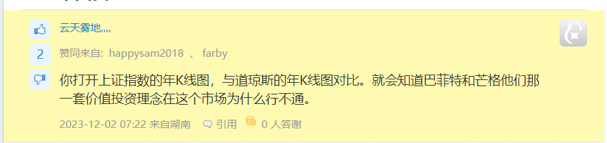 你打开上证指数的年K线图,与道琼斯的年K线图对比。就会知道巴菲特和芒格他们那一套价值投资理念在这个市场为什么行不通。这可是你自己的原话。