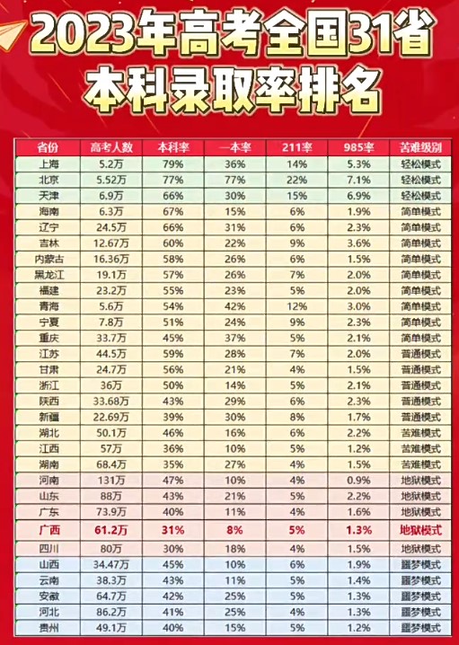 这表也太不客观了,广西云南高考不会难度大过江苏湖北,内蒙宁夏高考也不会难过北京上海。
