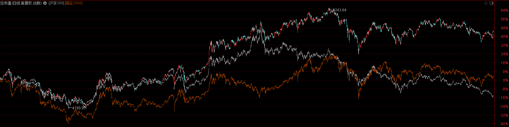 21年2月以后A股总市值和国证2000指数走势完全一致,并且总市值至今变化不大,但沪深300下跌了40%。说明发行了更多股票,分走了总市值蛋糕,沪深300下跌的市值被新增发的股票吃掉了,然后新增发的股票就进入国证2000的前述交易状态。