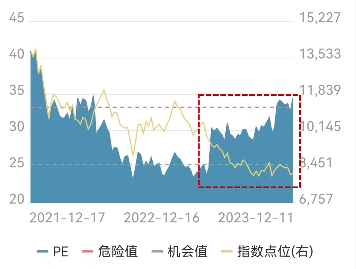 是的,这位朋友的疑问,下面这张图可能看得更清楚一些。其中,红色框内,代表指数点位的黄色线是一路向下,代表PE的蓝色印象却陡然上扬。