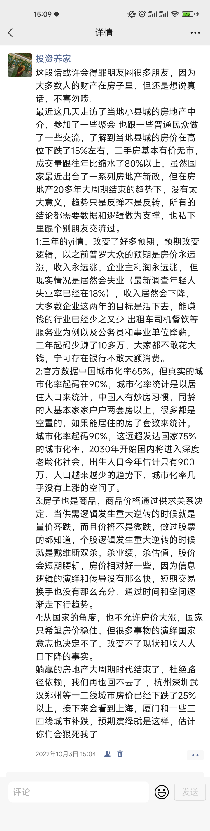 最近成交数据有一些挺有意思的点, 正好印证了大佬的观点: 西部和小城市近期量价都开始逐渐跑赢全国水平线, 倒是上海还有周边几个前两年没咋跌的城市如宁波, 今年都是冷的要死我最近在宁波。听网约车司机说很多外地人都准备回老家了…