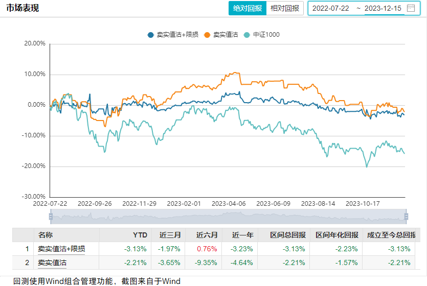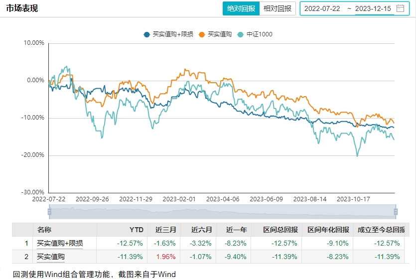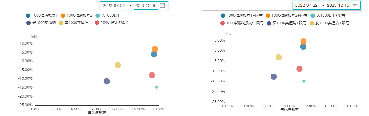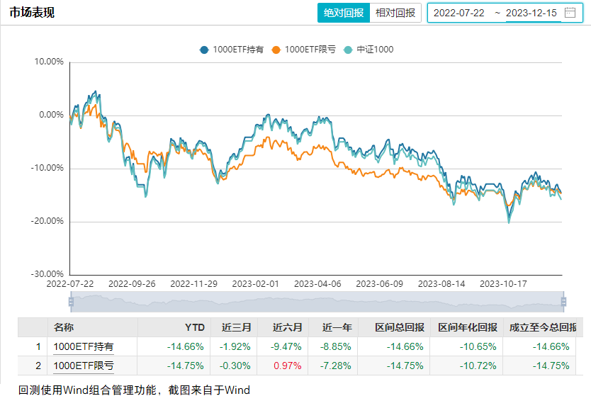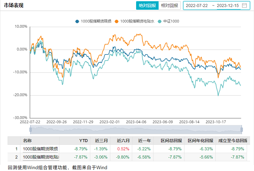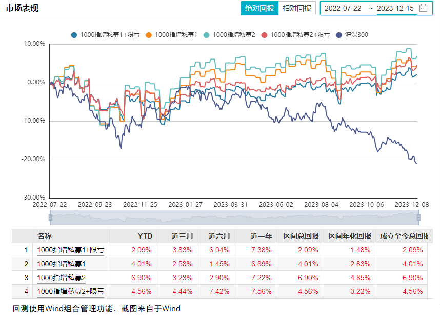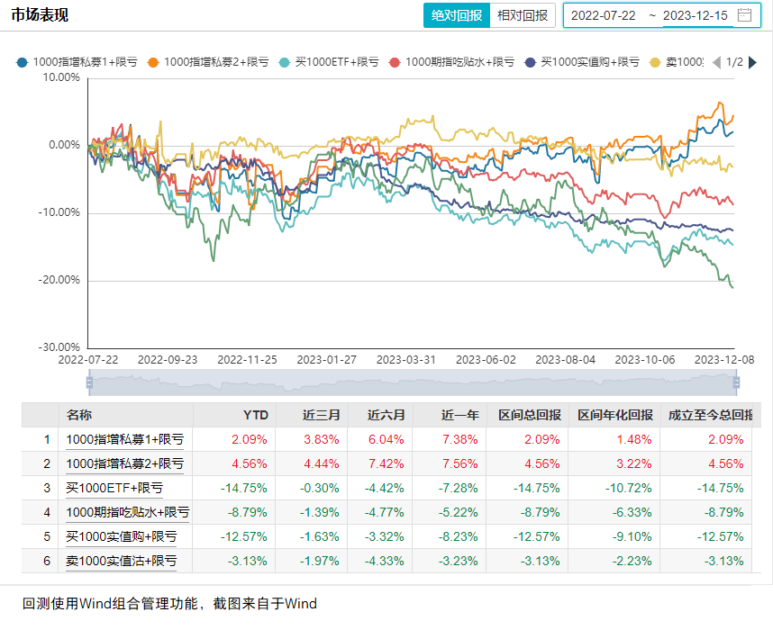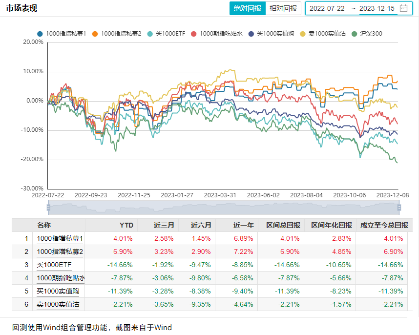 为研究该策略的表现,本文选择了1000ETF、股指期货、买实值购、卖实值沽、2只私募基金进行了回测,将结果分享给大家,供大家参考(时间区间为2022.7.22-2023.12.15,时间较短,注意投资风险)