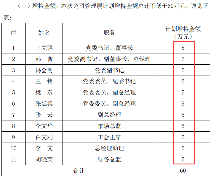 但是11位总金额合计只有60万元,比如董事长计划增持8万,财务总监计划增持5万