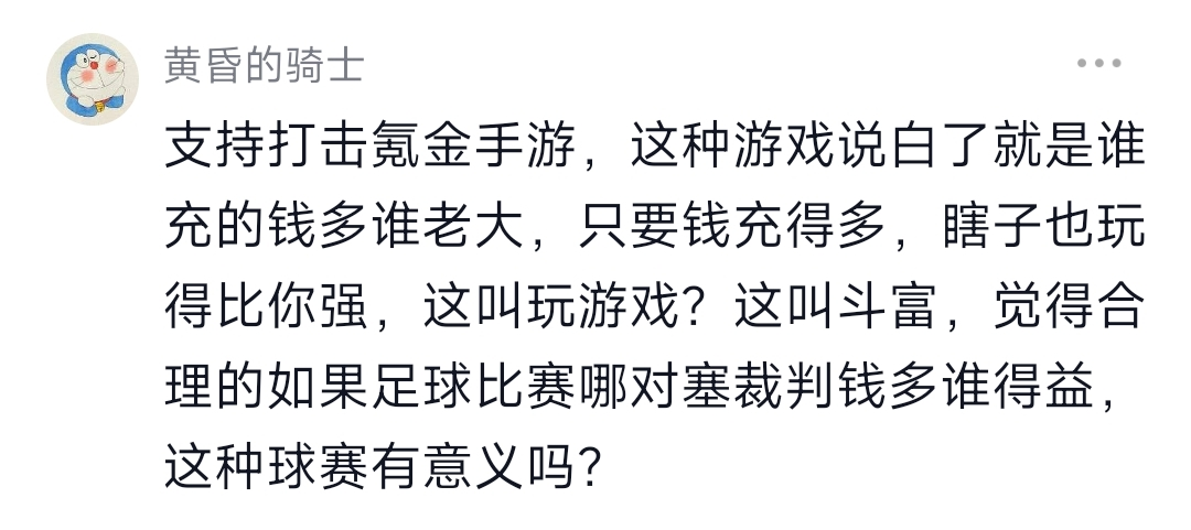 现在土豪不给充钱 平民玩家不给吃排骨 也不给靠月卡连续登录之类的东西获得点资源满足一下自己虚荣心 打着保护平名玩家的旗号对两头都重拳出击 只会两边都得罪 最后大家带着游戏一起死