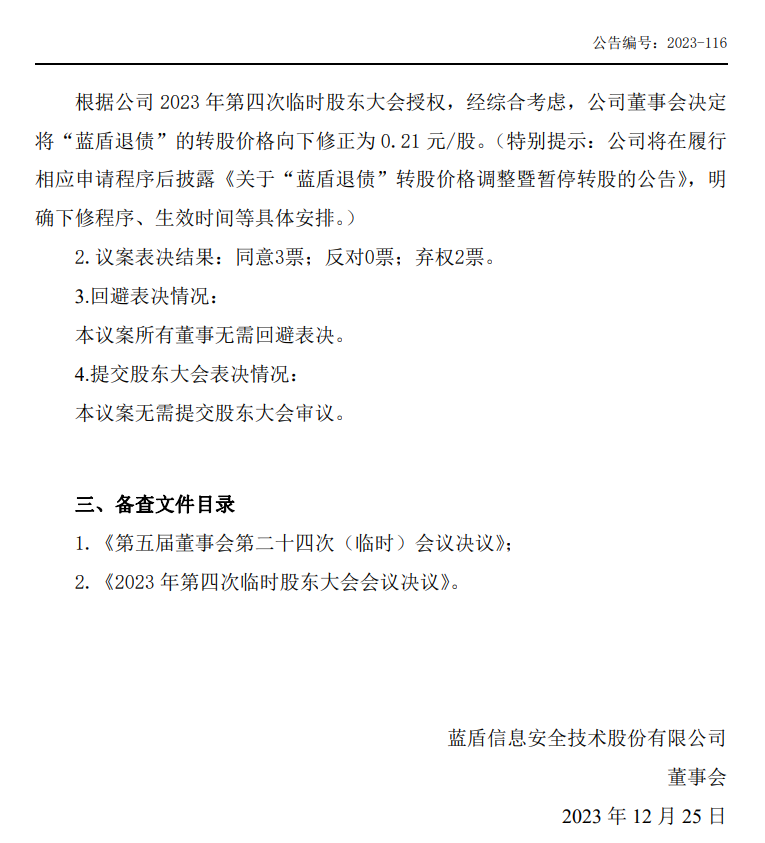 蓝盾转债下调转股价至0.21元/股(下调一分钱)