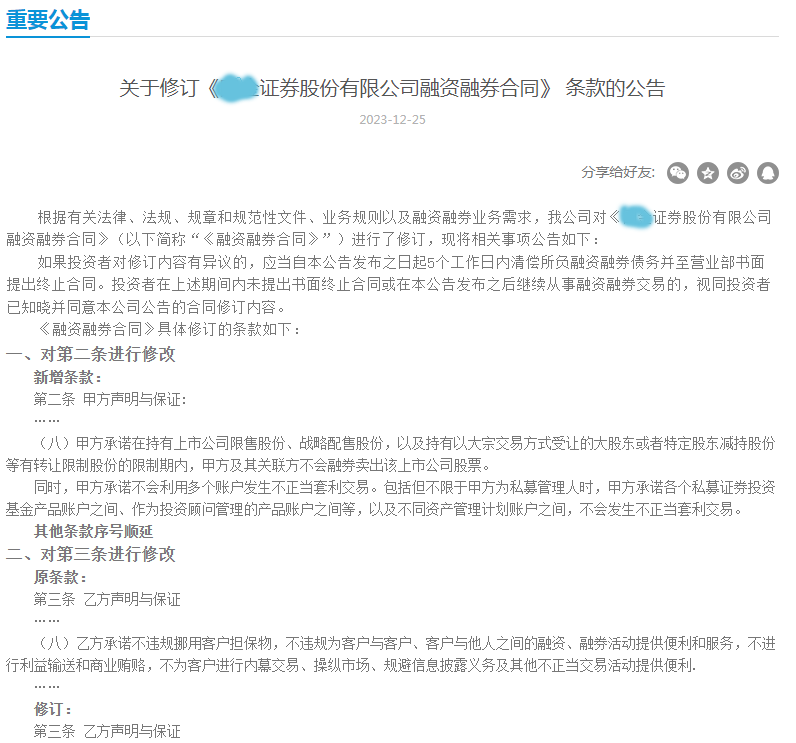 据记者了解,根据 10 月份沪深交易所发布的《关于优化融券交易和转融通证券出借交易相关安排的通知》要求,券商已按新规对客户进行相关约束。新规中明确," 投资者在持有上市公司限售股份、战略配售股份,以及持有以大宗交易方式受让的大股东或者特定股东减持股份等有转让限制股份的,在限制期内,投资者及其关联方不得融券卖出该上市公司股票 ",并于 10 月 16 日起实施。各家券商跟客户约束的情况不一,有的采取修订合同,有的则签署承诺书。