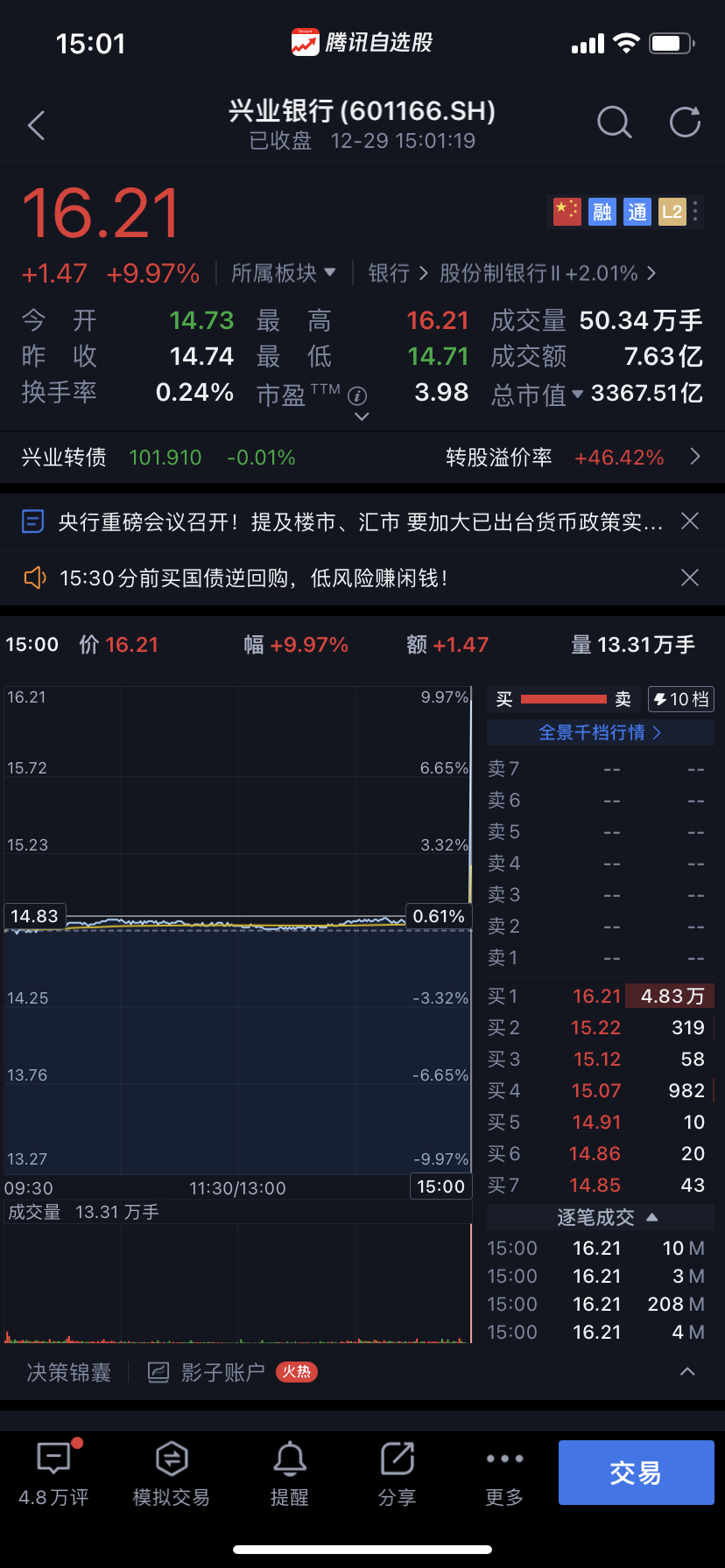 尾盘兴业银行直线拉涨停?