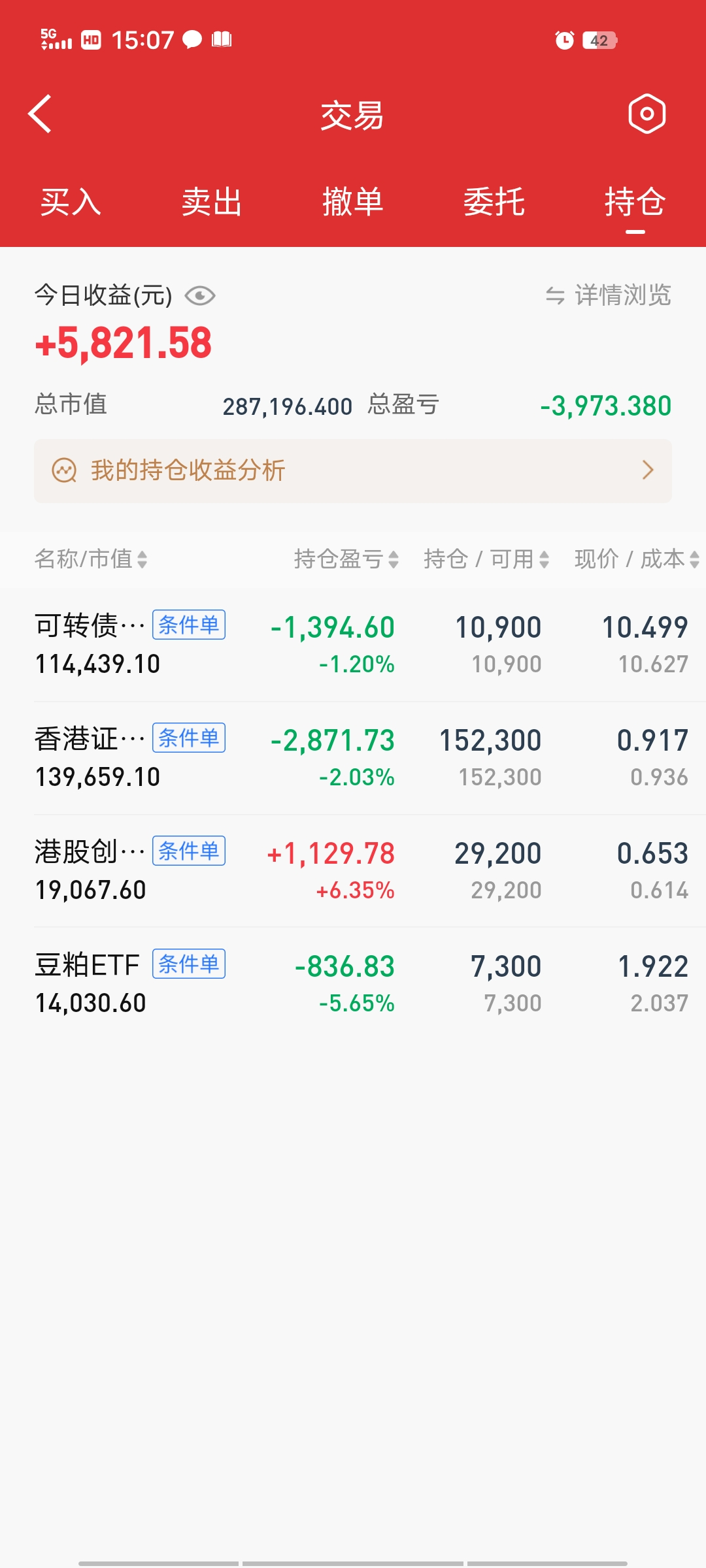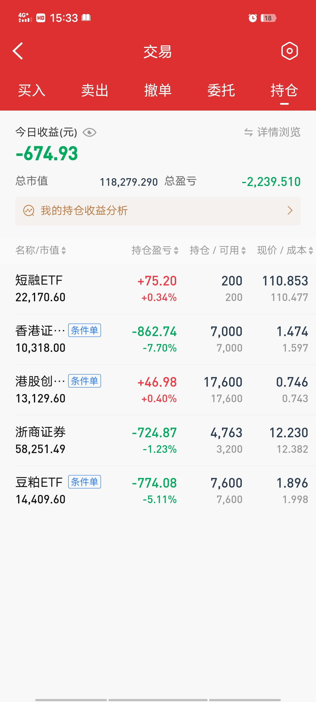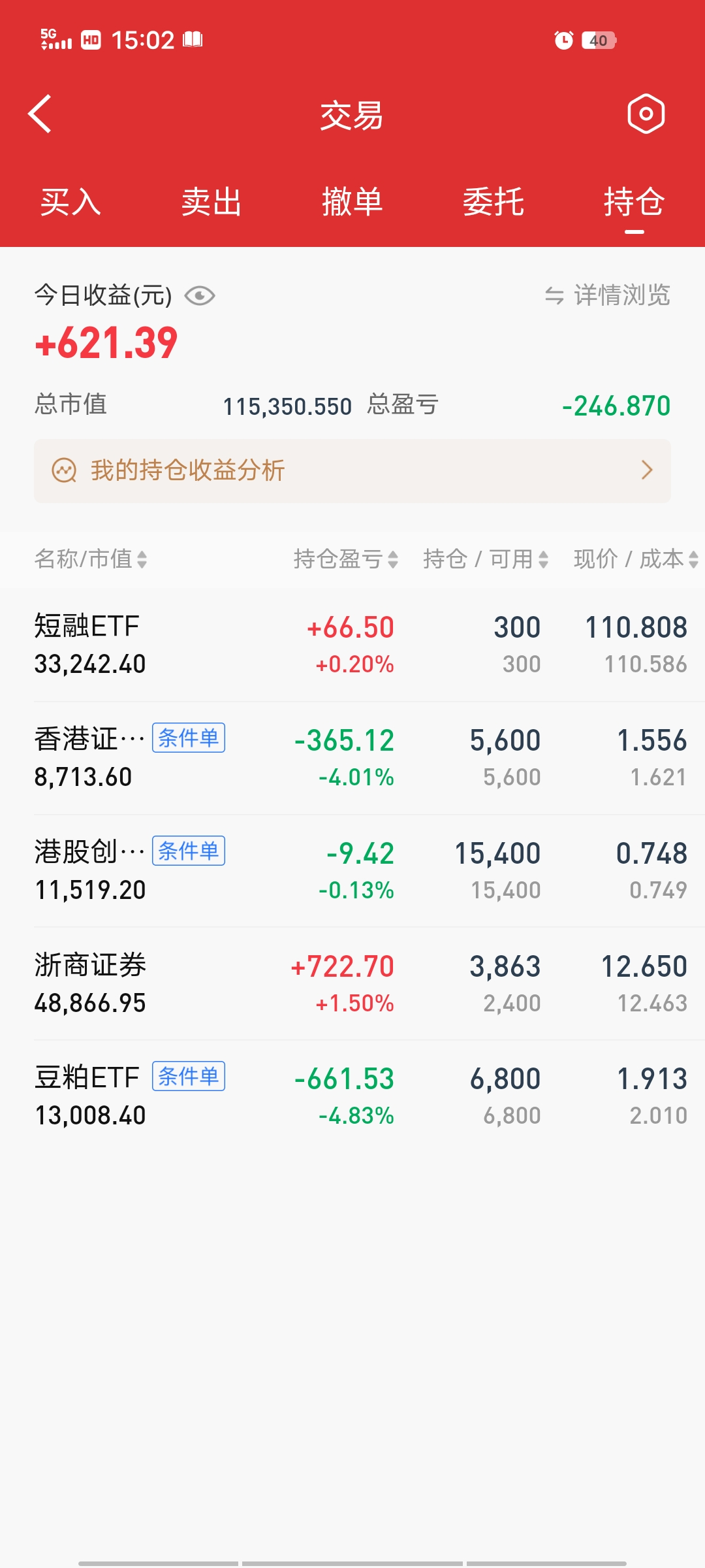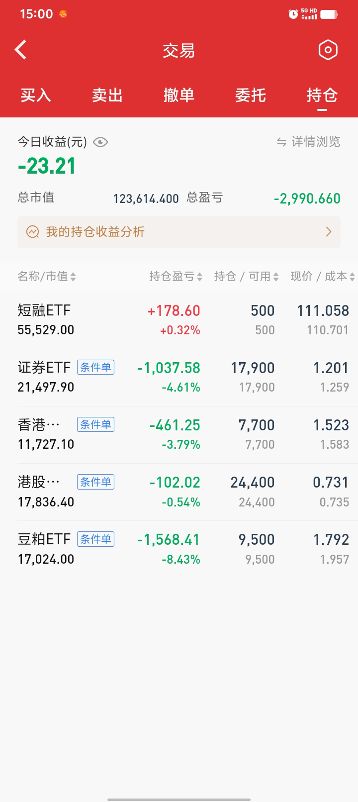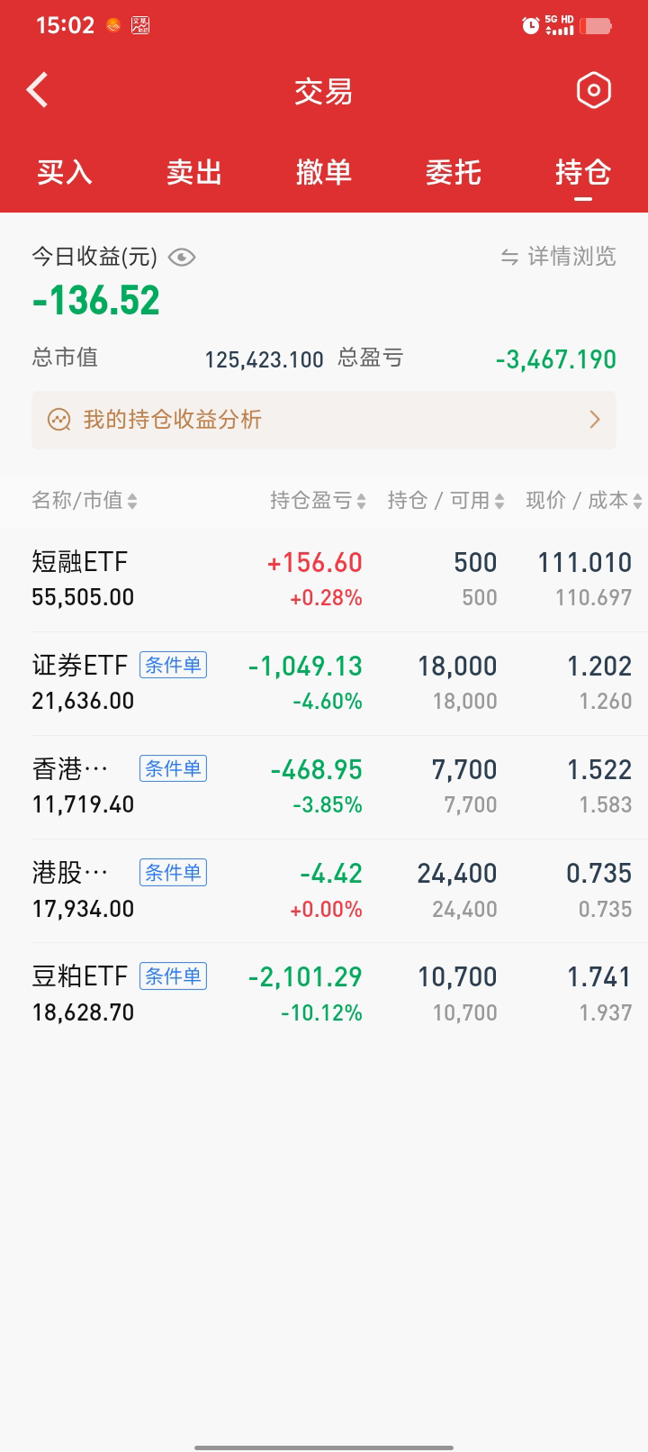 基金继续网格,新增380和浙22,380没按计划,盘中看到比最后出局的价格低了一些,就买了。午盘挂单买入浙22,挂3.5点出局的条件单,结果最高只涨了3点左右没出,不然还能买点便宜货,那就等周一吧。也是从10月重新开始,本周期末负400块。
