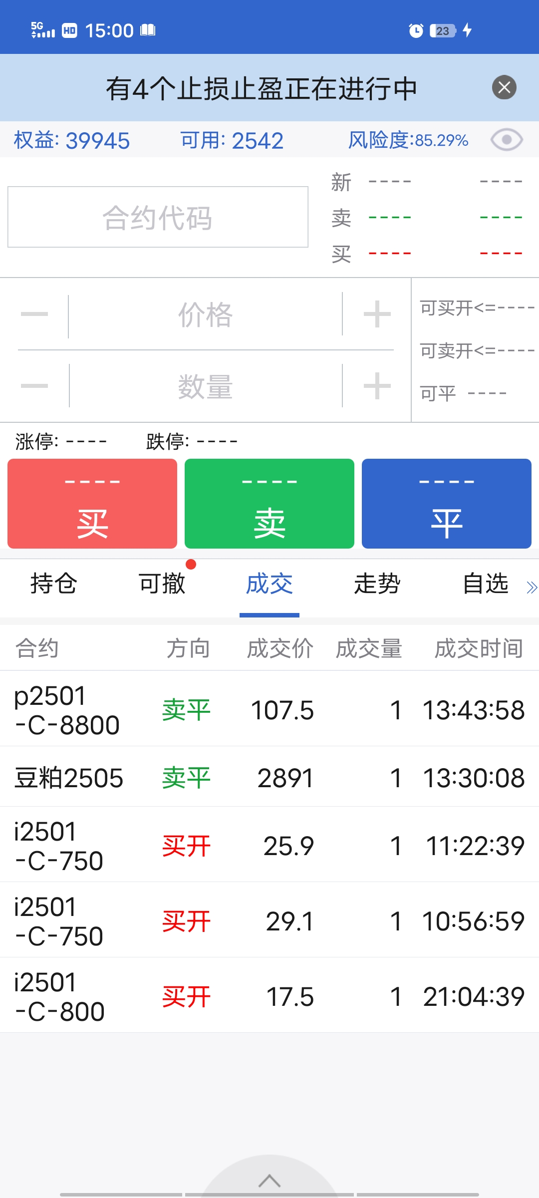 手动2282入rm05和5334入v05。合计已有5手仓,合约价值约12万,大概1/6仓。后面可以慢点了,4点左右进出吧,粕有两个,就错开一点,间隔大点。为明年做准备,偷笑,捂脸。