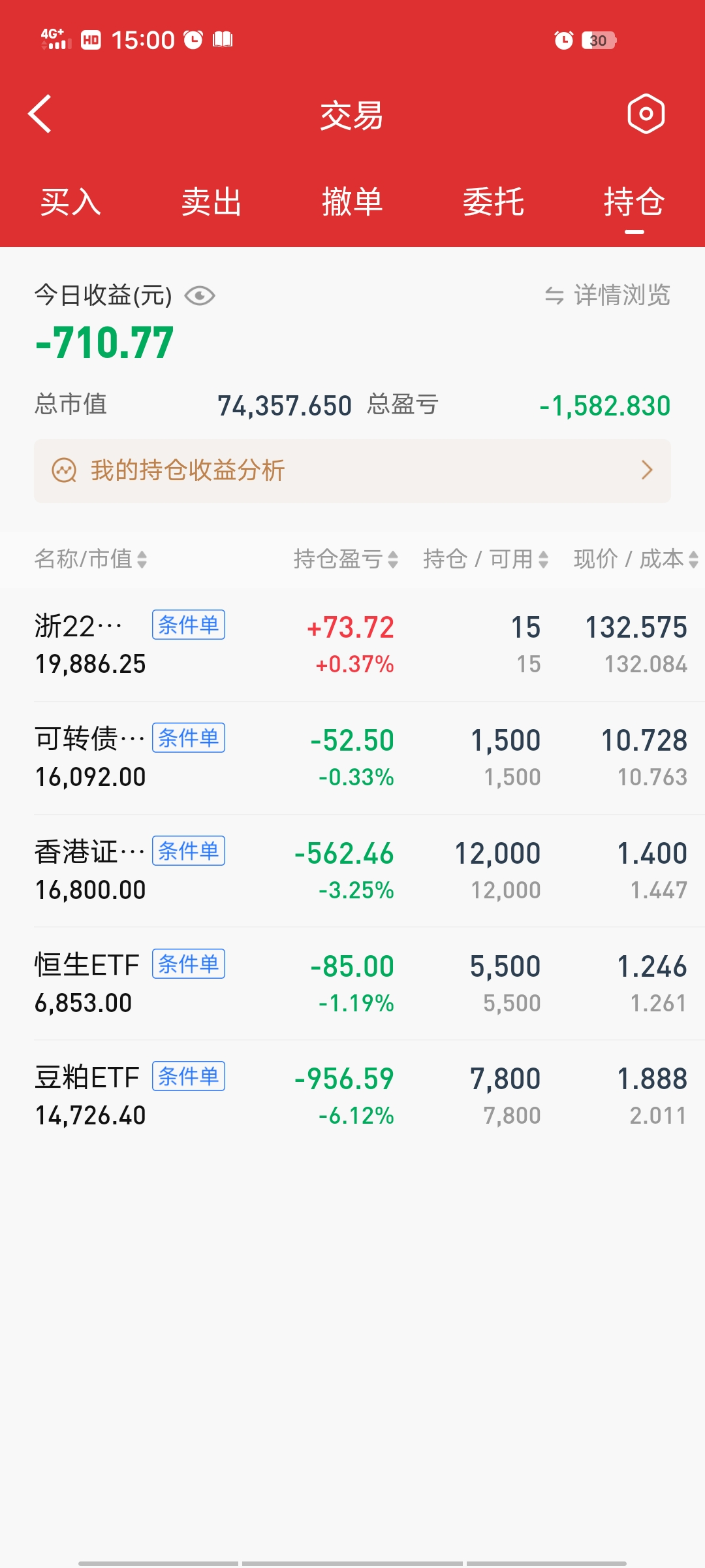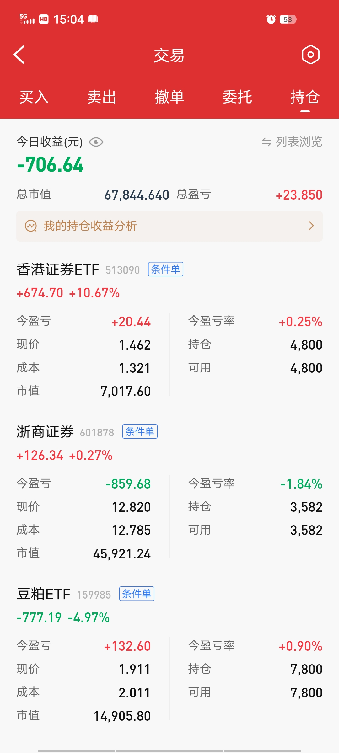 64买入sac1520,其他都是手动交易,45.1进ic800,挂错单46.2出,应该是挂56.2,正100块。43.6重进。m2584进一手。今天所有买入的品种都在跌,小惨。感觉都是便宜货,既然这样,那就考虑增加点仓位,减少基金的,正好证券目前价格感觉有点高了。
