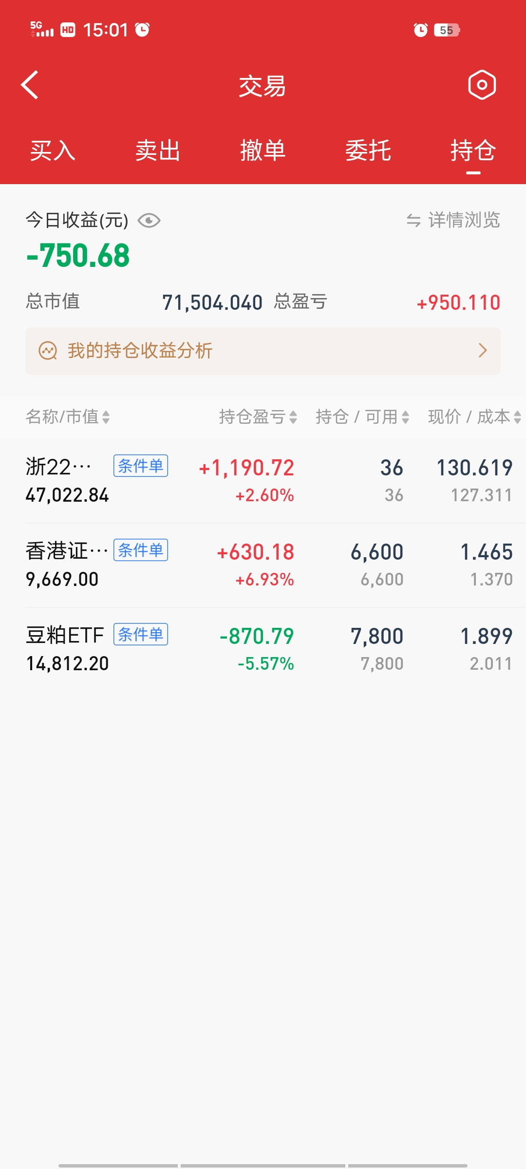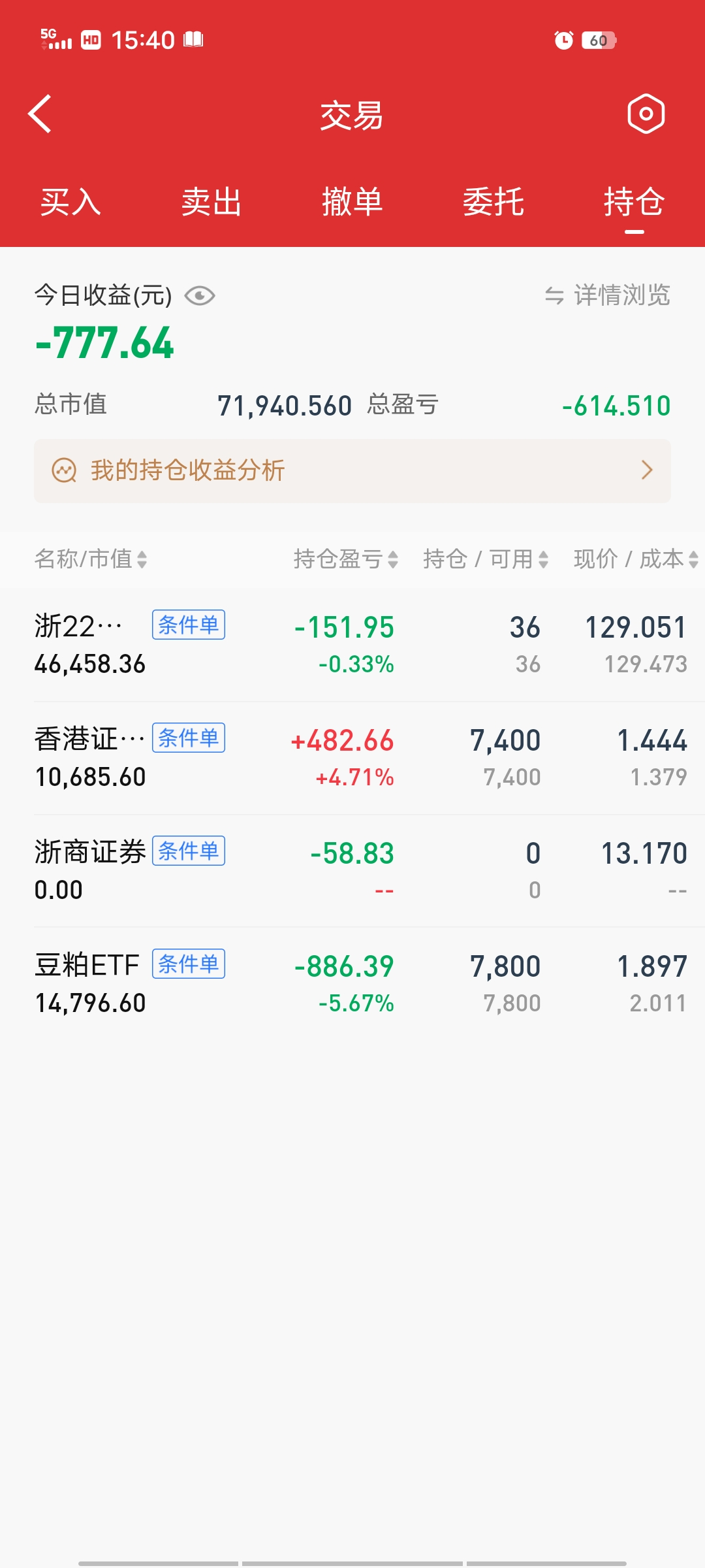 继续网格,没啥波动今天,090进一,豆粕e出万一。浙22终于没有啥折价了,我也不用折腾了,哈哈。后面就按3点左右的网格进出浙商。假设跌20点左右的话就再买个6-7万,也就亏个1万5左右,可以接受。