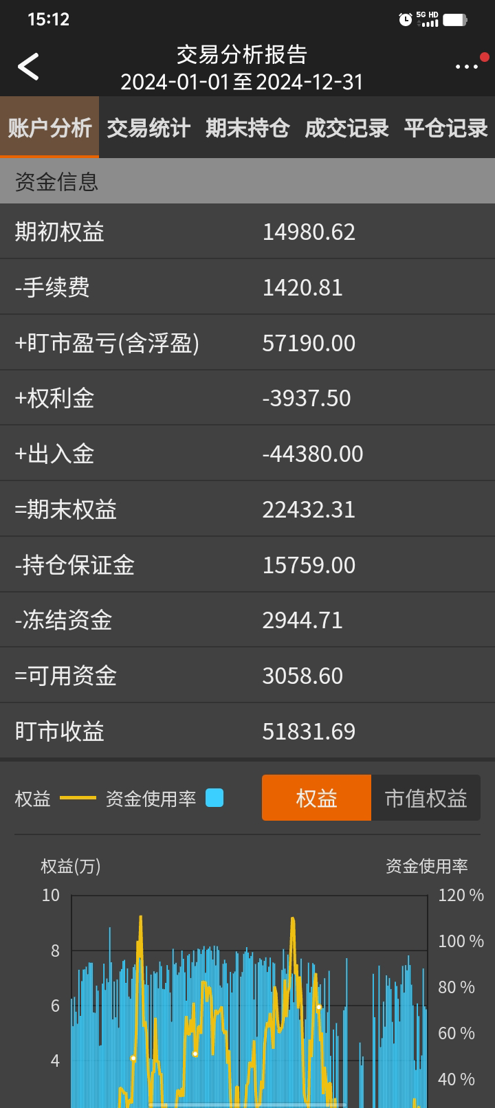 期货账户,今年期末盈利正6.26万,手续费1471块。盈利的主力是yyds铁,次p和fu,其他盈亏差不多持平吧。除了手续费多了一些,10月份以后手动交易太多,过程和结果都不错,给自己的操作打75分吧。