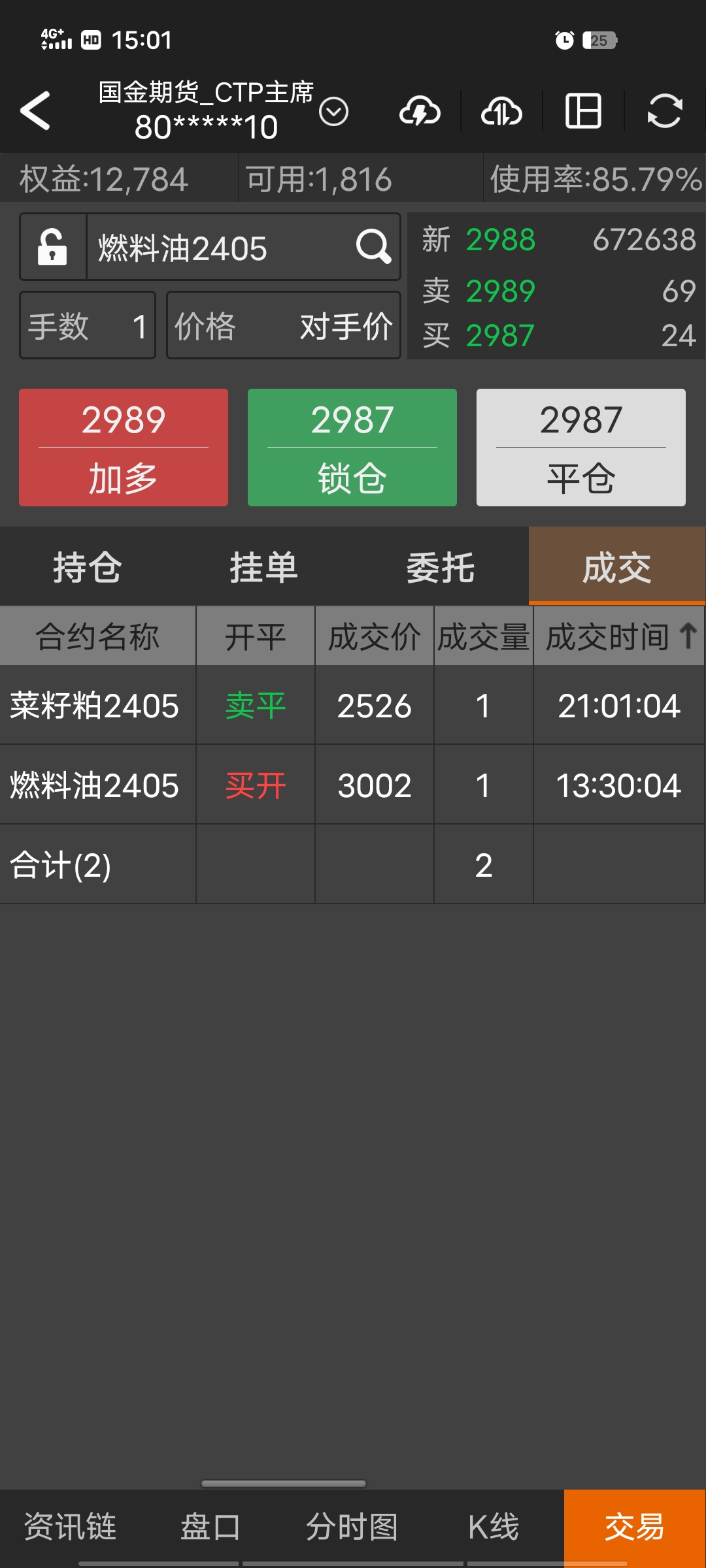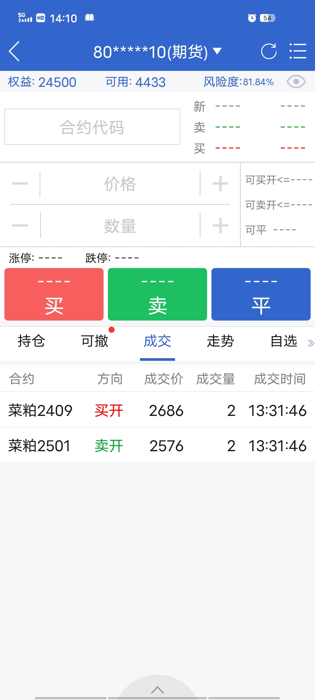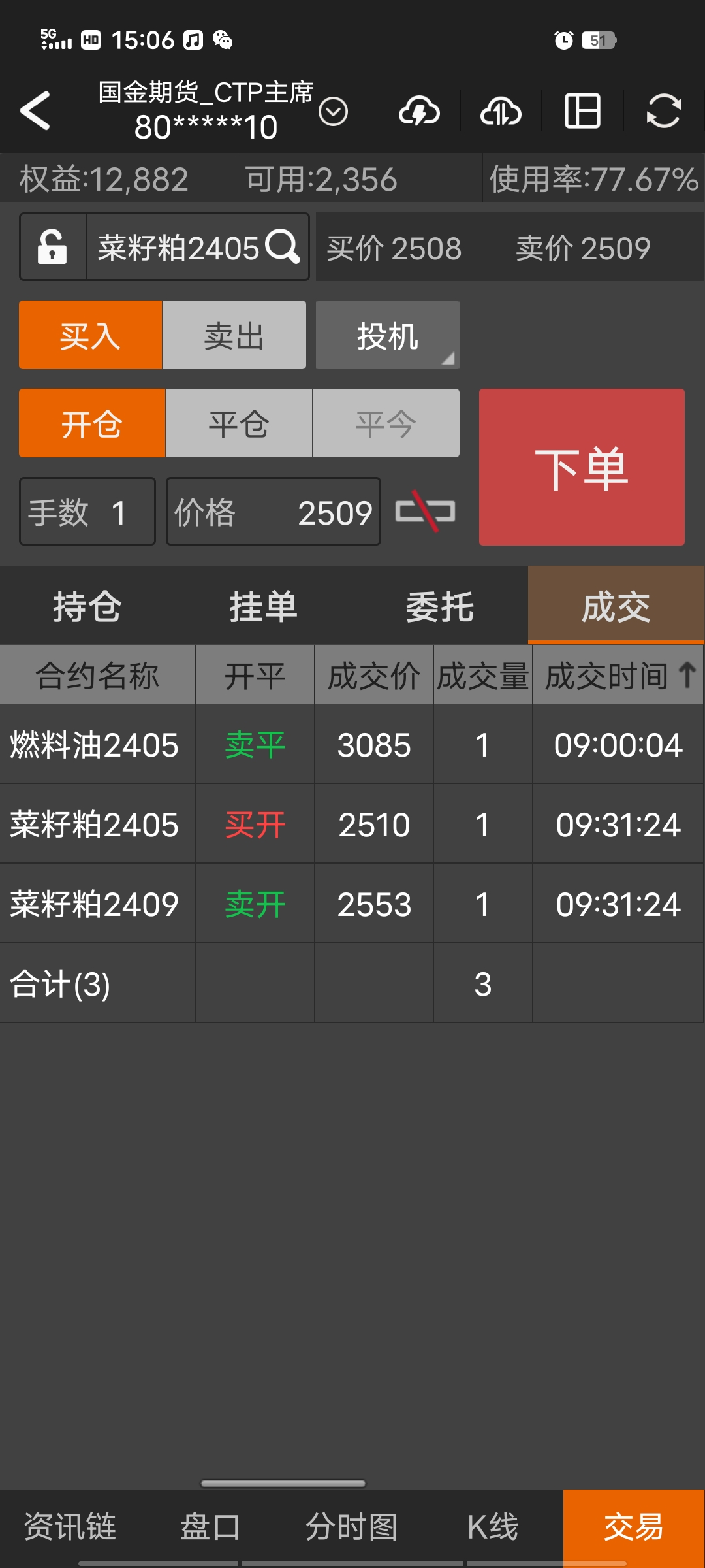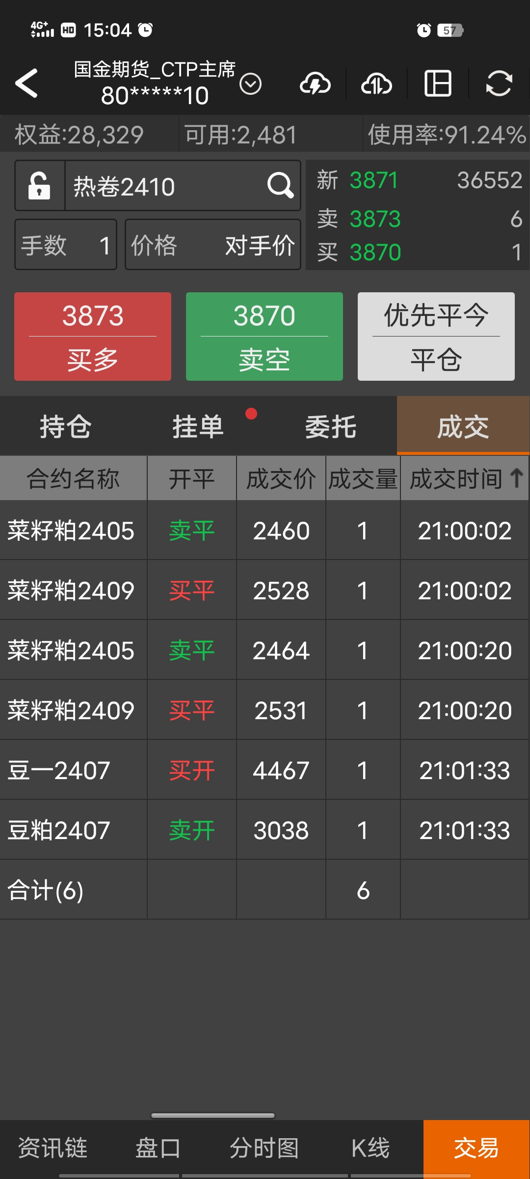按计划挂单2565成交,2534进,正300块。粕跌油小涨。原来计划出粕进油的,结果油没跌下来又上了,估计晚上可以再进粕了,呵呵。