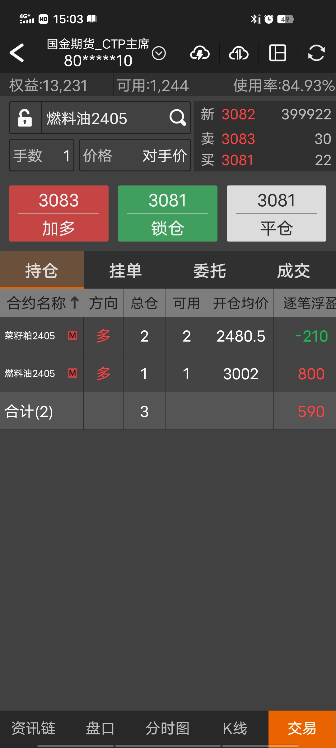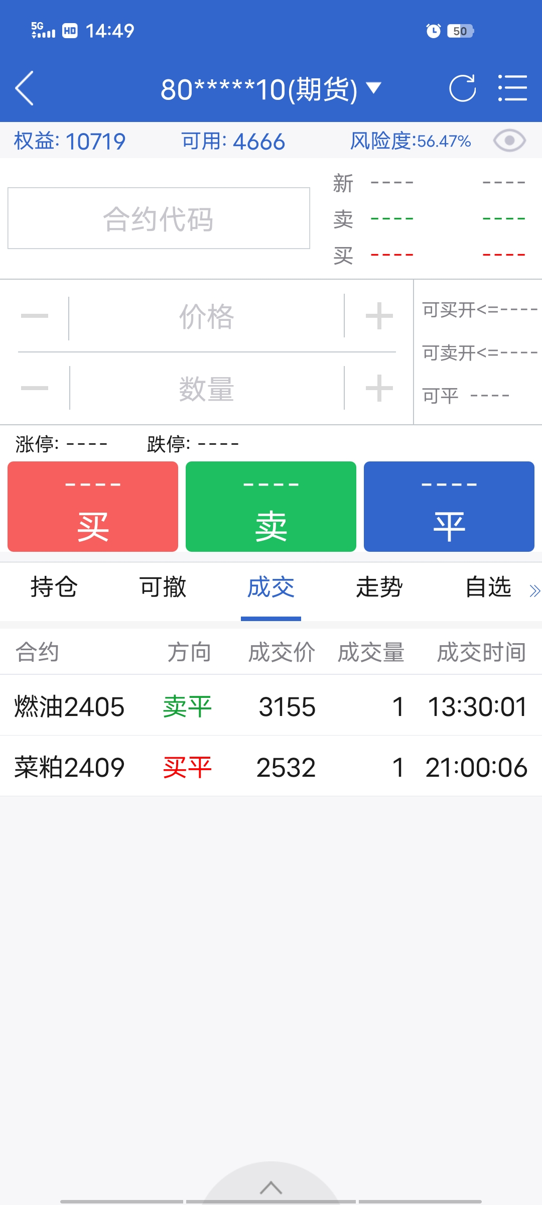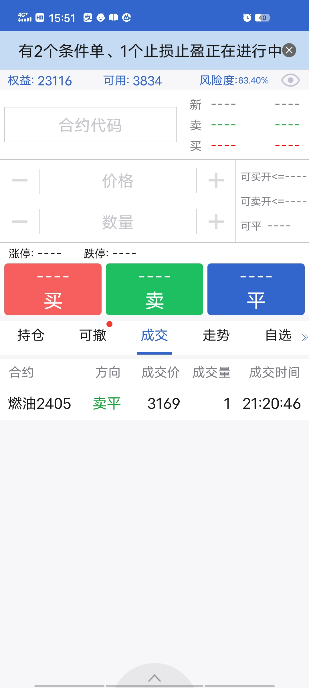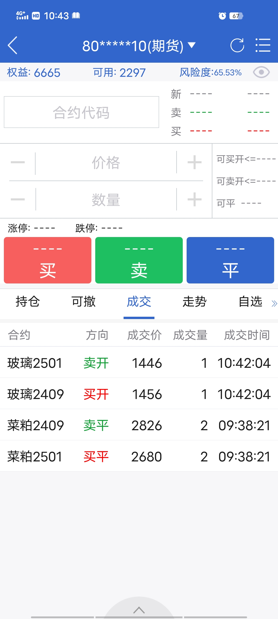 油条件单3085成交,2967进,正1170。按计划负43加一手粕套。还持有一手油,3011。粕一手2660。期末正2800块,还可以。没有非计划操作。