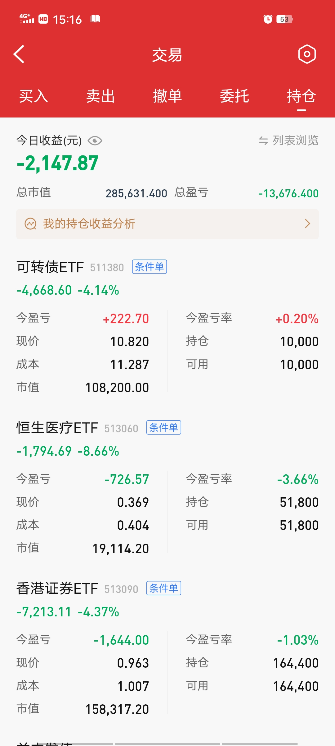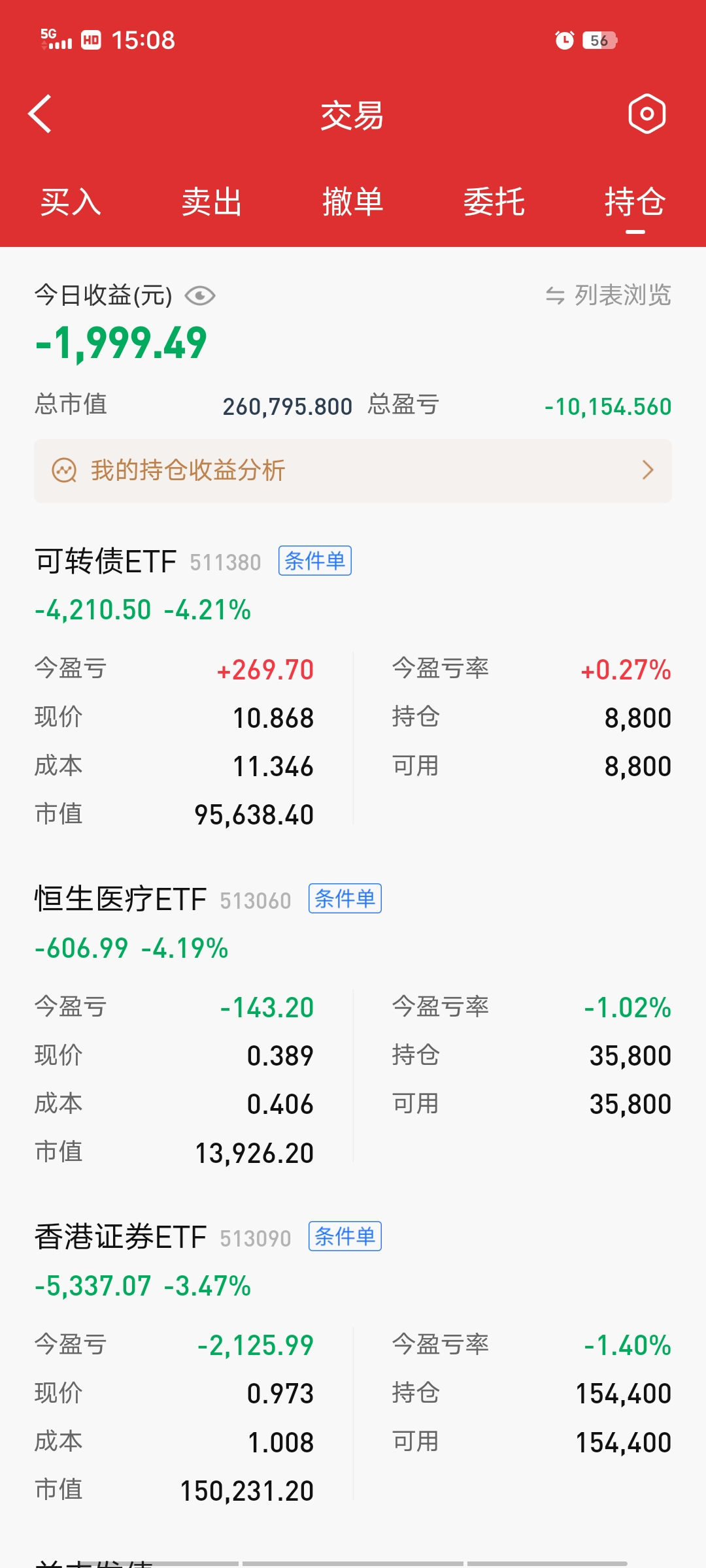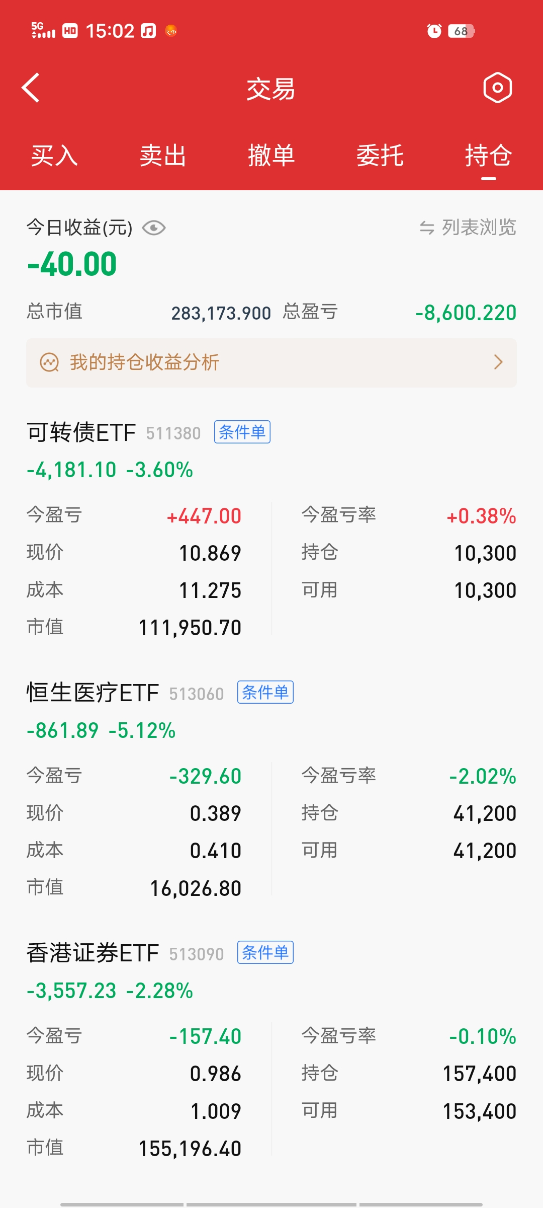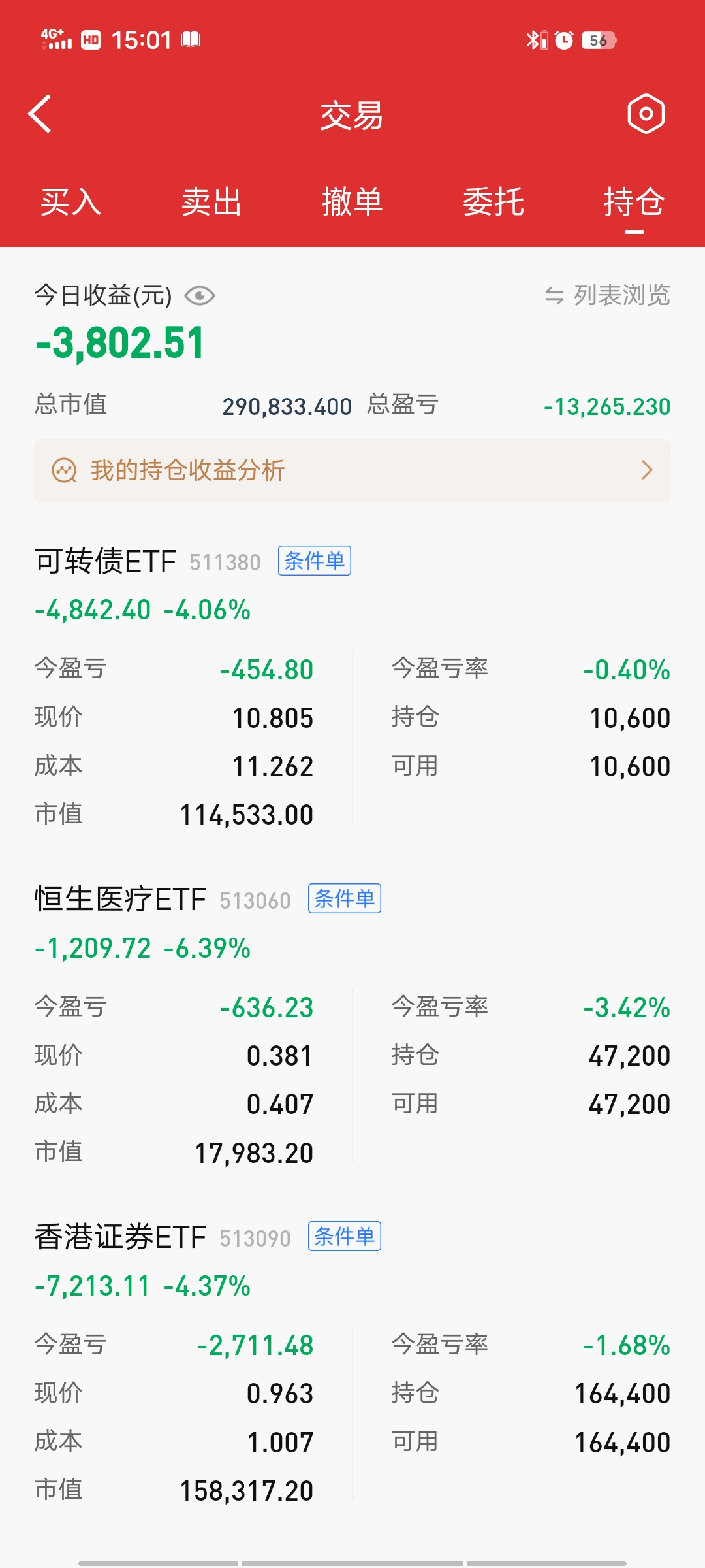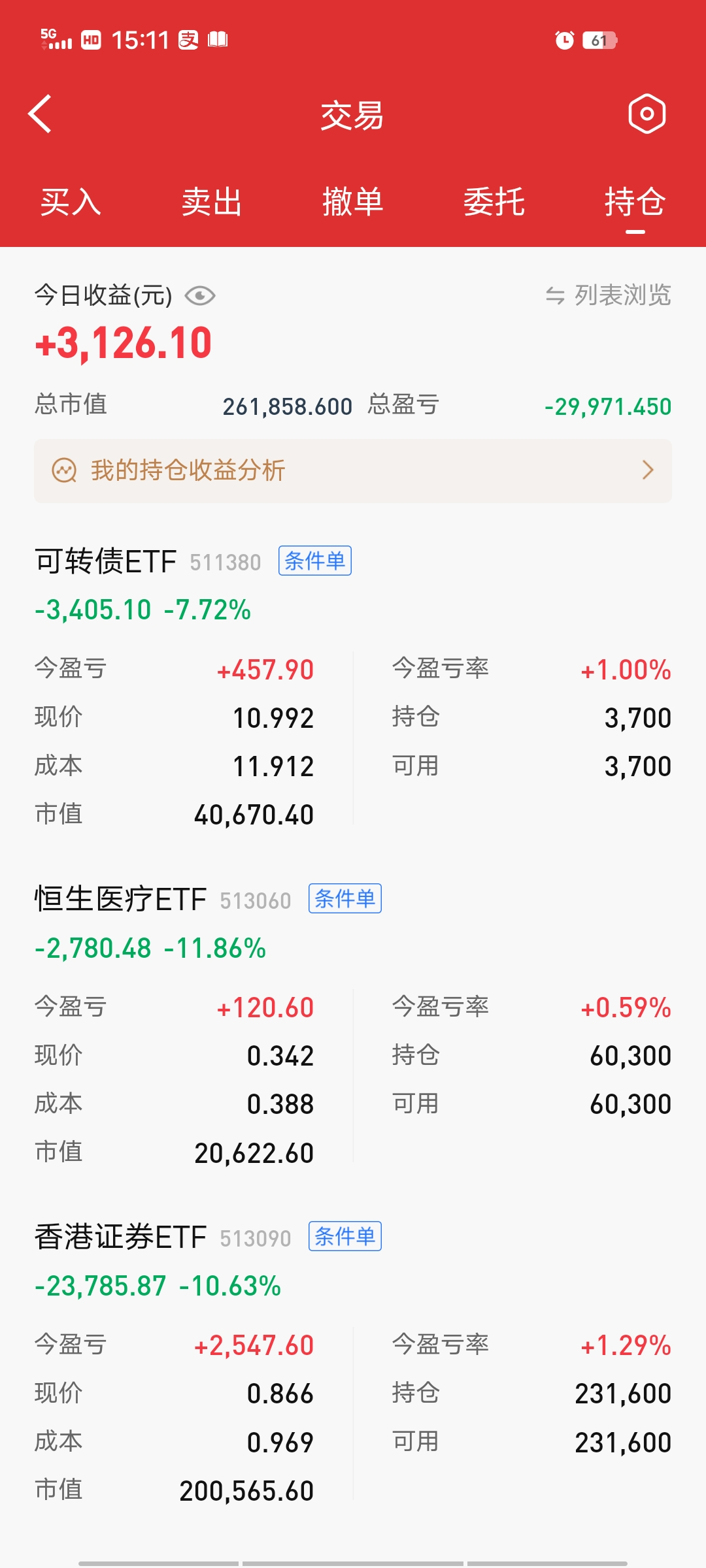 条件单触发,3029出,2977进,正510块,持有10来天,也不错。波动不大。粕有点拉。朋友你的网格和我的网格品种差不多,不过没有转债ETF换成银行ETF。期货几年没有网格交易了,最后做网格那年是2019年,网格燃油,经常跳空高开或者低开。现在只网格商品期权,可惜商品期权成交量太少了