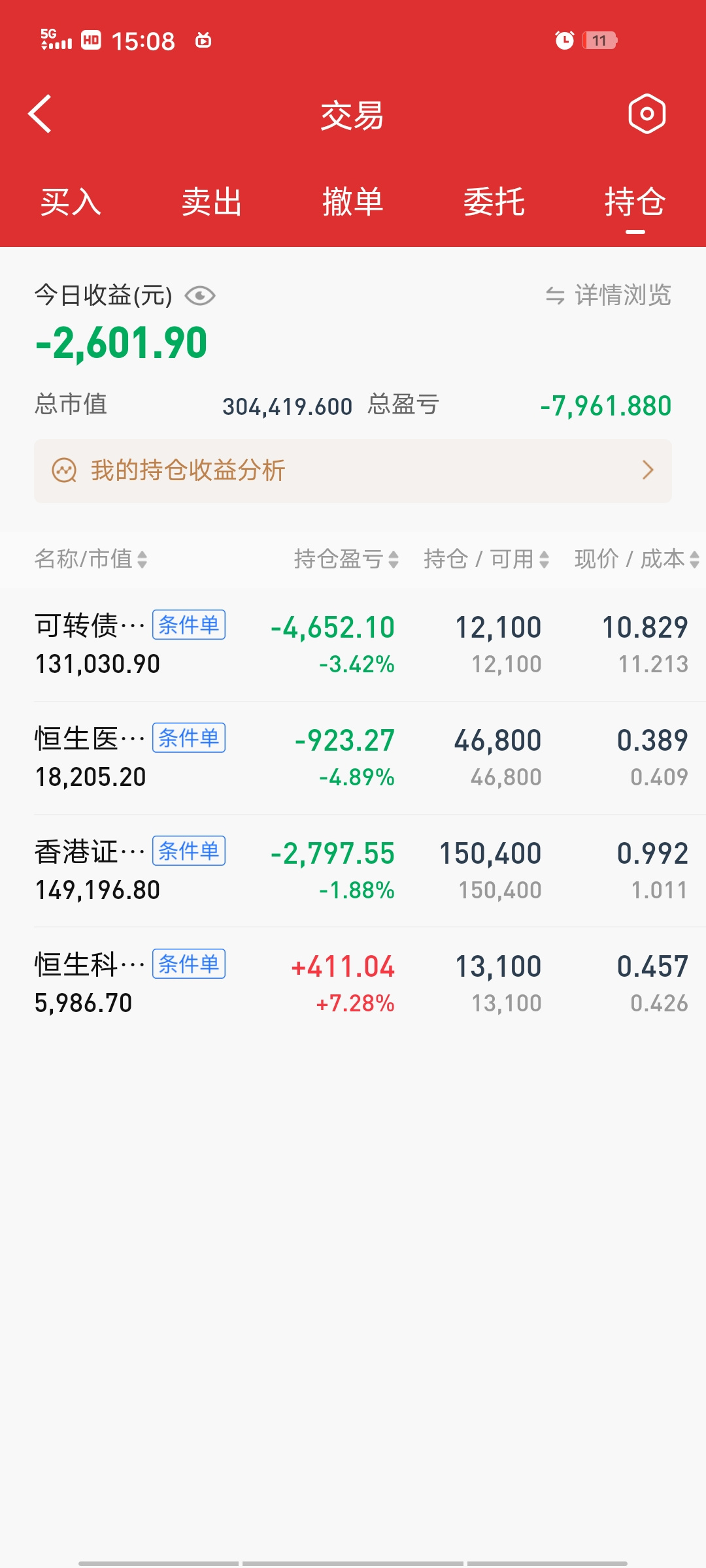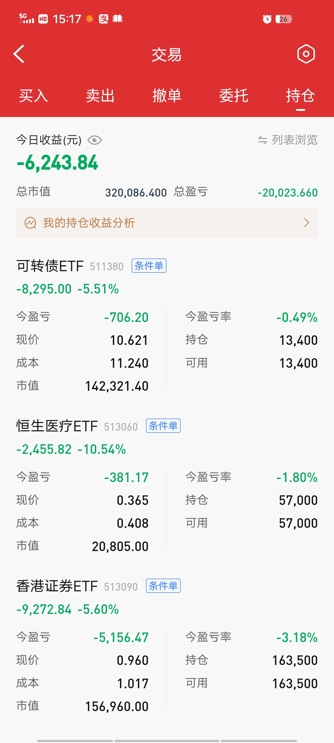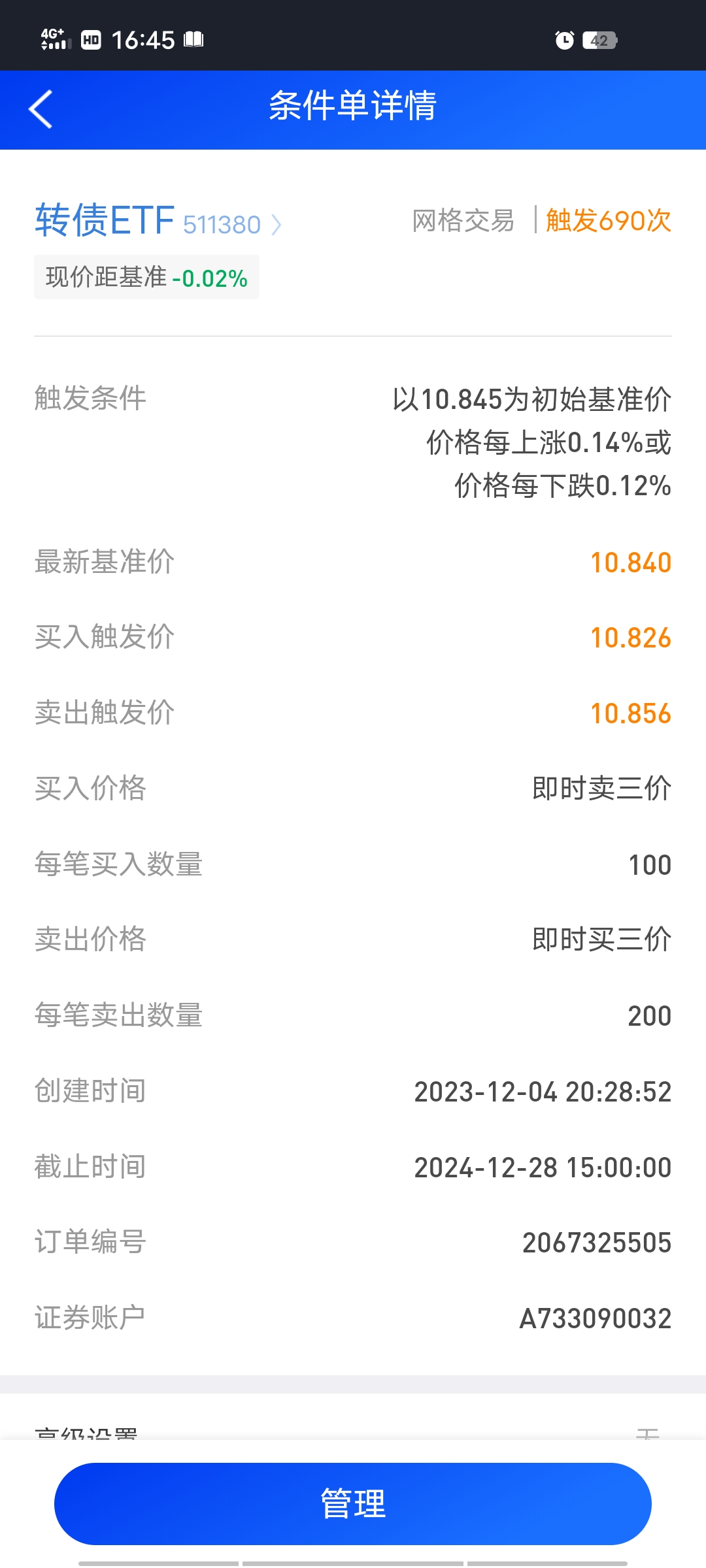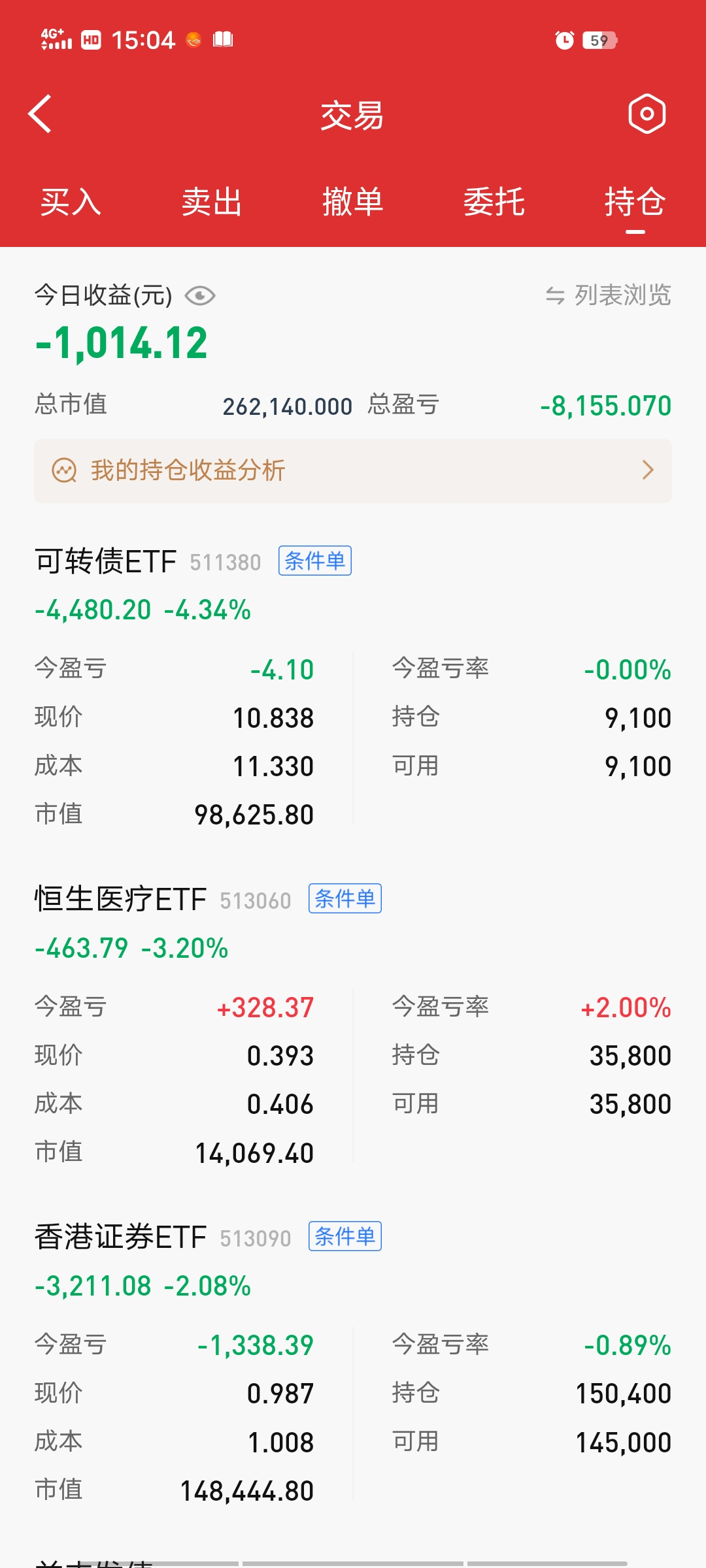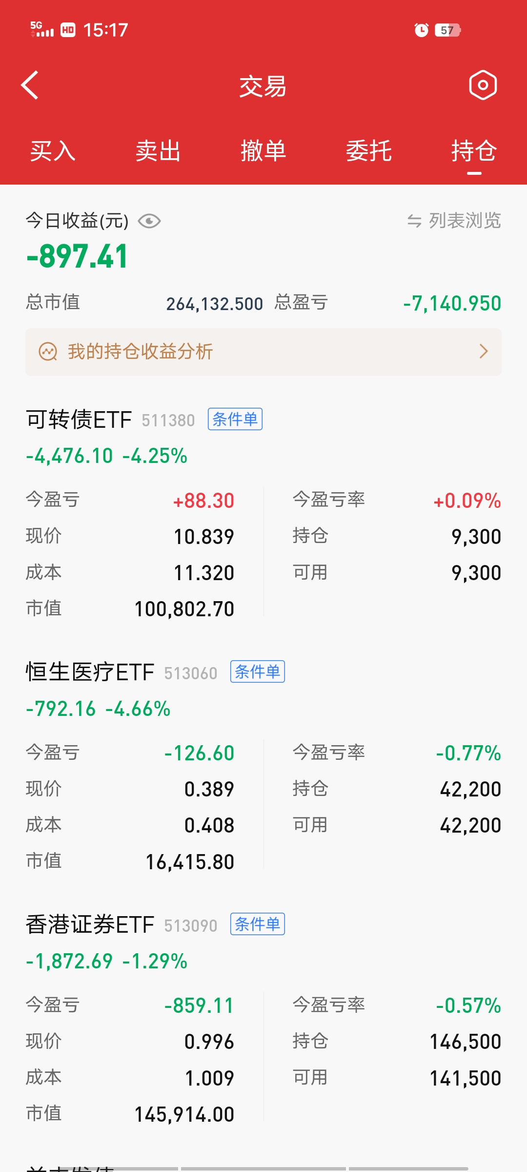 条件单触发,3029出,2977进,正510块,持有10来天,也不错。波动不大。粕有点拉。朋友你的网格和我的网格品种差不多,不过没有转债ETF换成银行ETF。期货几年没有网格交易了,最后做网格那年是2019年,网格燃油,经常跳空高开或者低开。现在只网格商品期权,可惜商品期权成交量太少了
