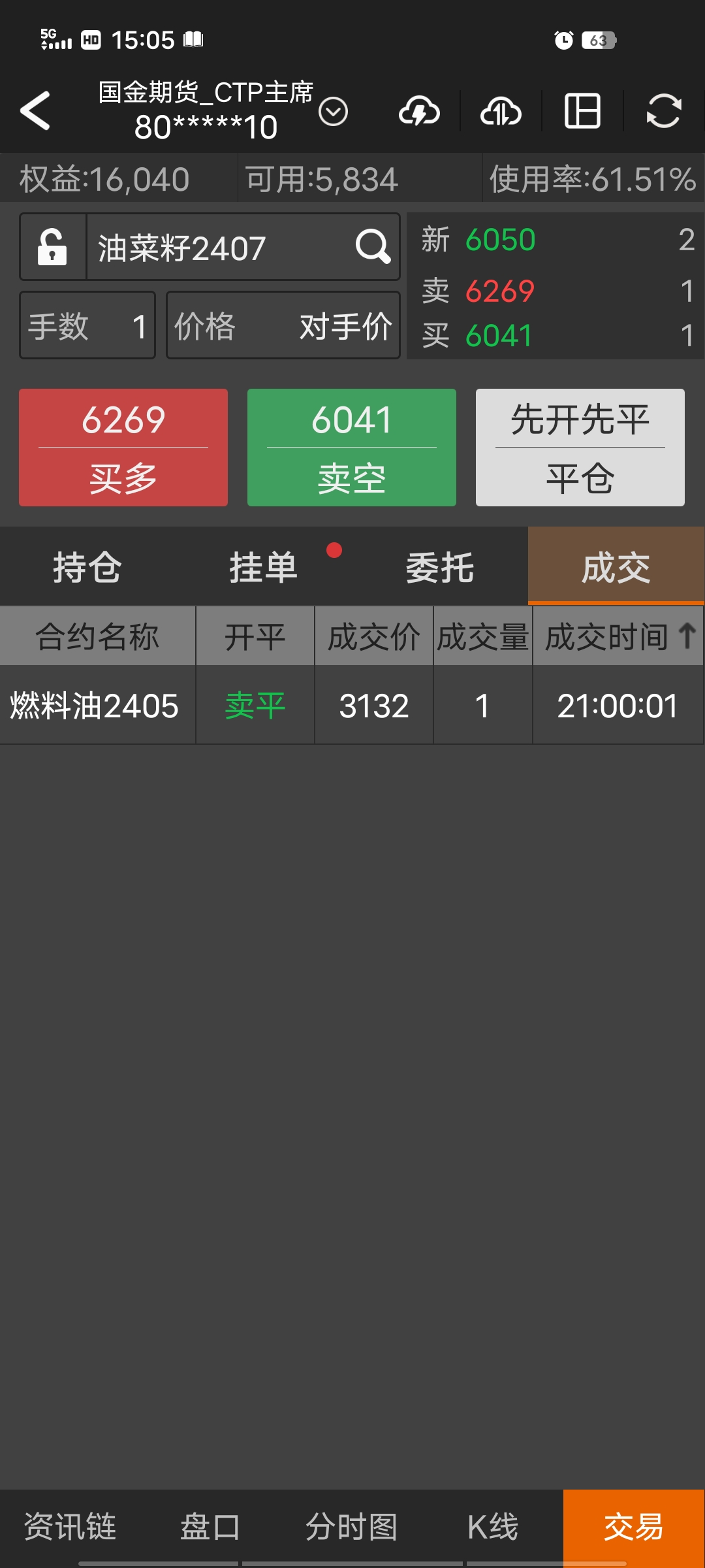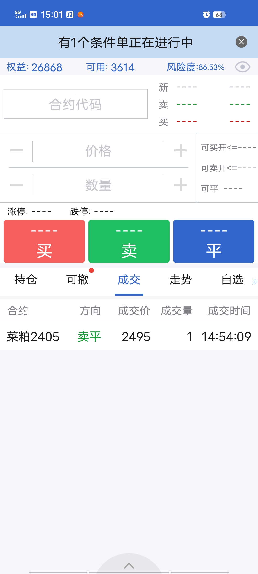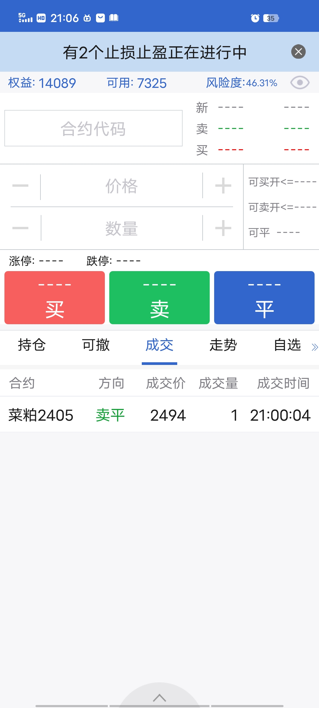 挂单3089买入油05一手,和第二手出局的价格差不多。粕挂条件单2541出,最高就到40,午盘计划挂33结果也没出成,应该挂30就成了,粕挣个500块都这么难,偷笑。晚上再看看。