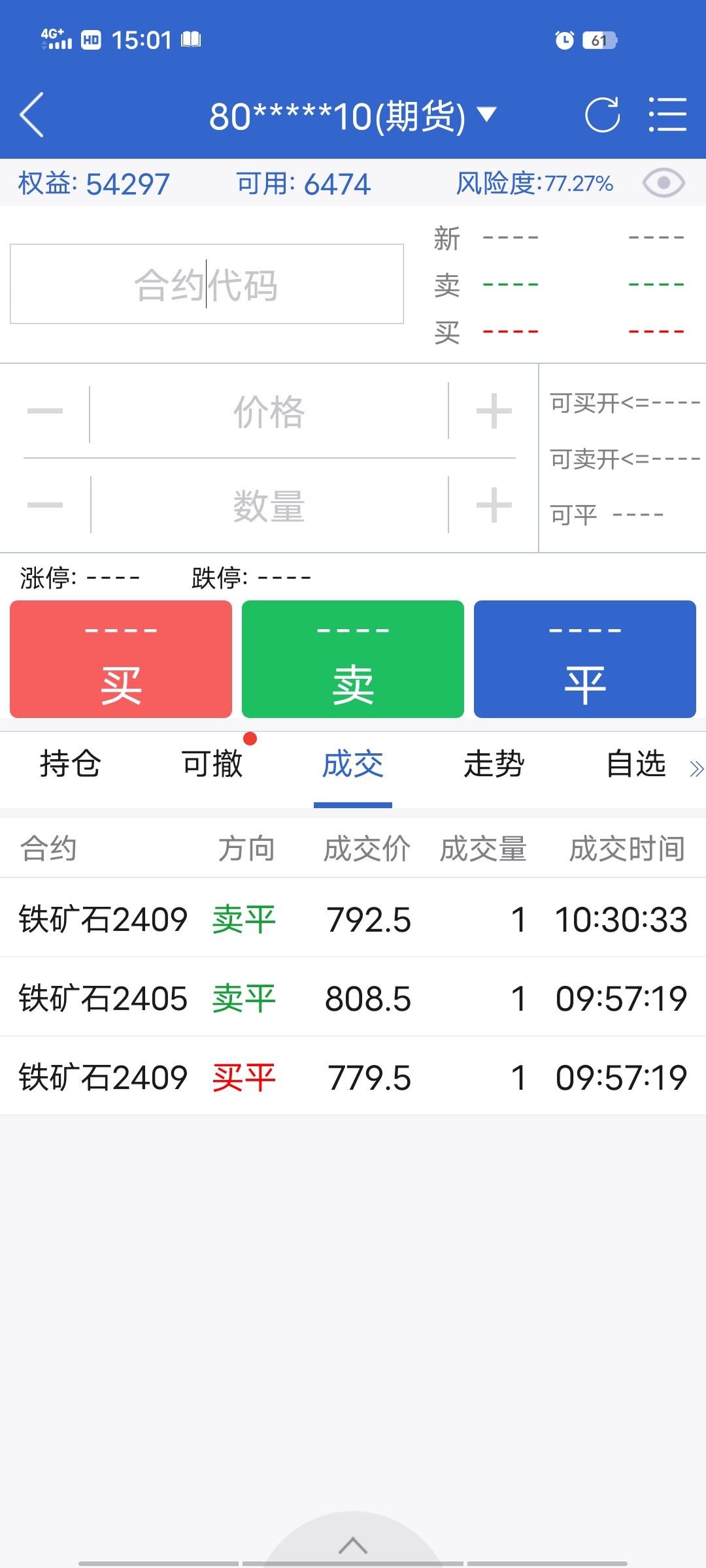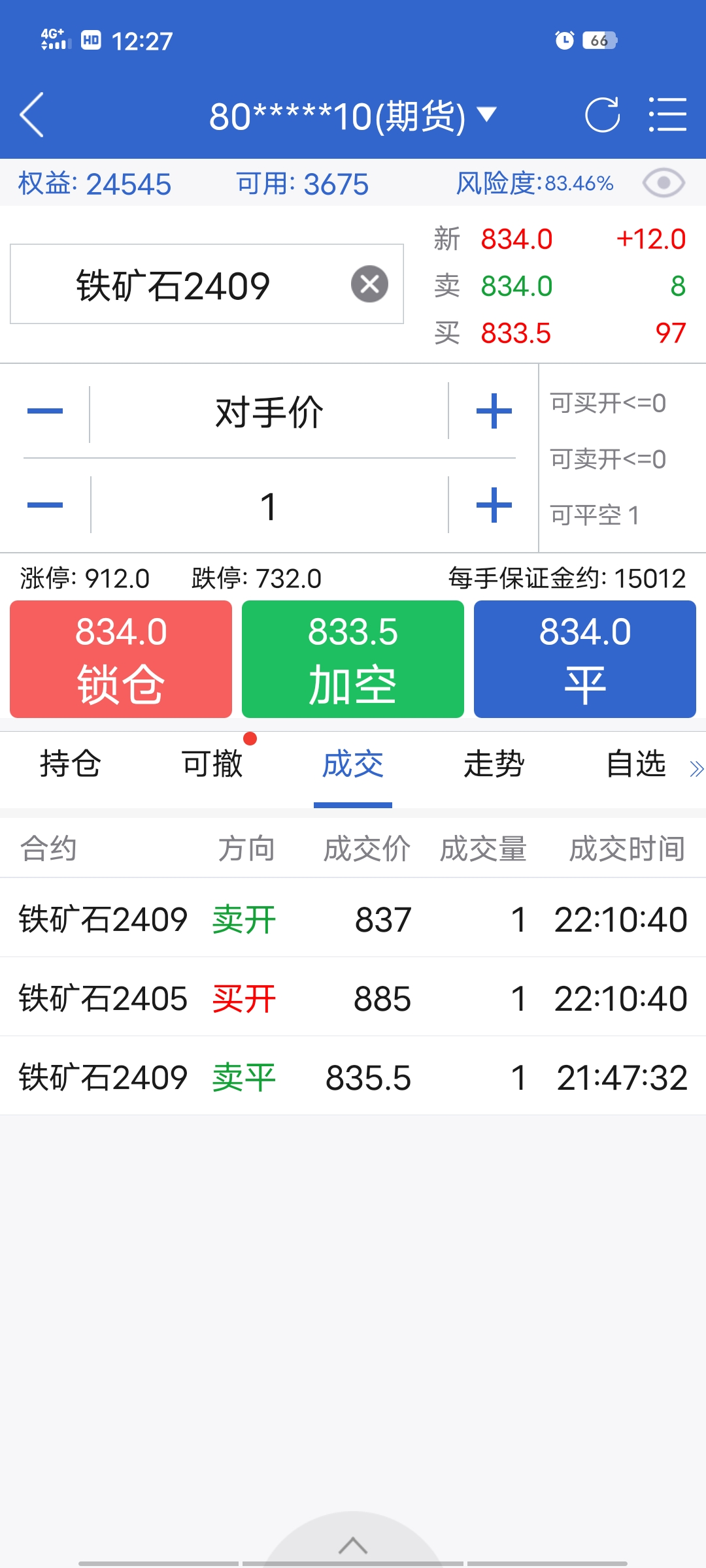 条件单成交2495,成本2660,亏1660。总计粕亏500块左右。铁有点弱,挂842就到838,挂836就到833.5,偷笑,这不,又到805了,捂脸。还是有点急了,好的地方是减了一个品种。780左右加一手。