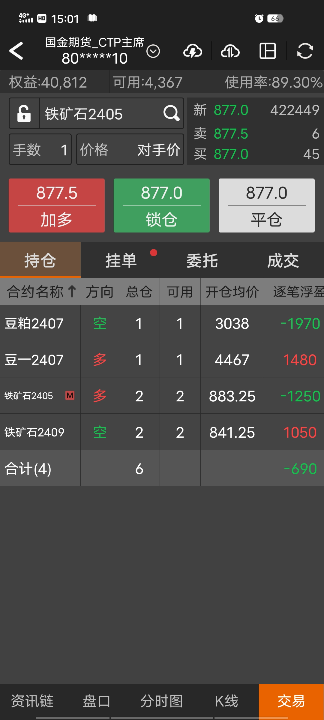 按计划3090买入油05。观察几天了,决定买一手铁,大概有半年左右没碰了吧。818.5进铁09,为减少一点风险,2446平粕,正150块。铁的话40点左右进一手,出的话30点左右。后续如果大跌就继续减粕套和粕。最多4手左右,也就是半仓的样子。加基金总资金无杠杆即可。