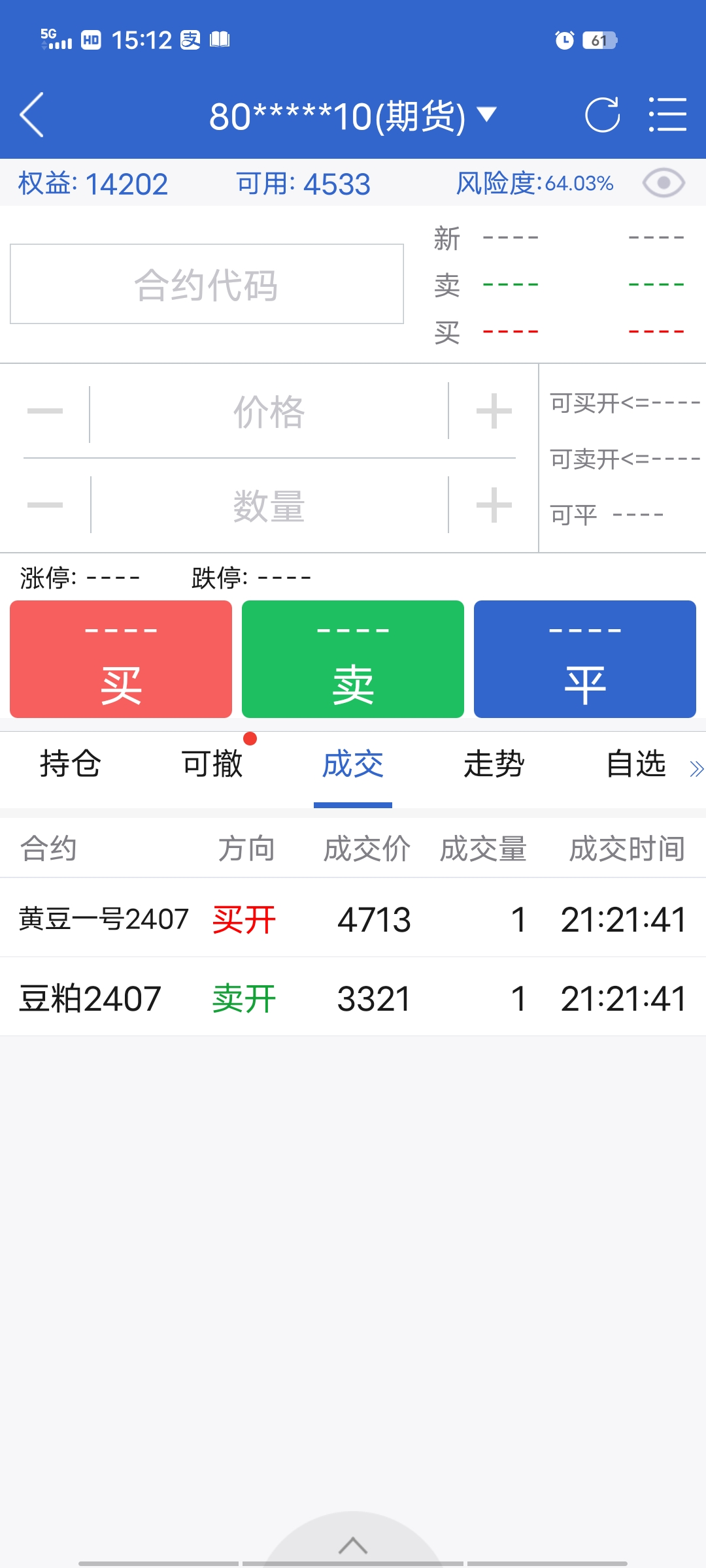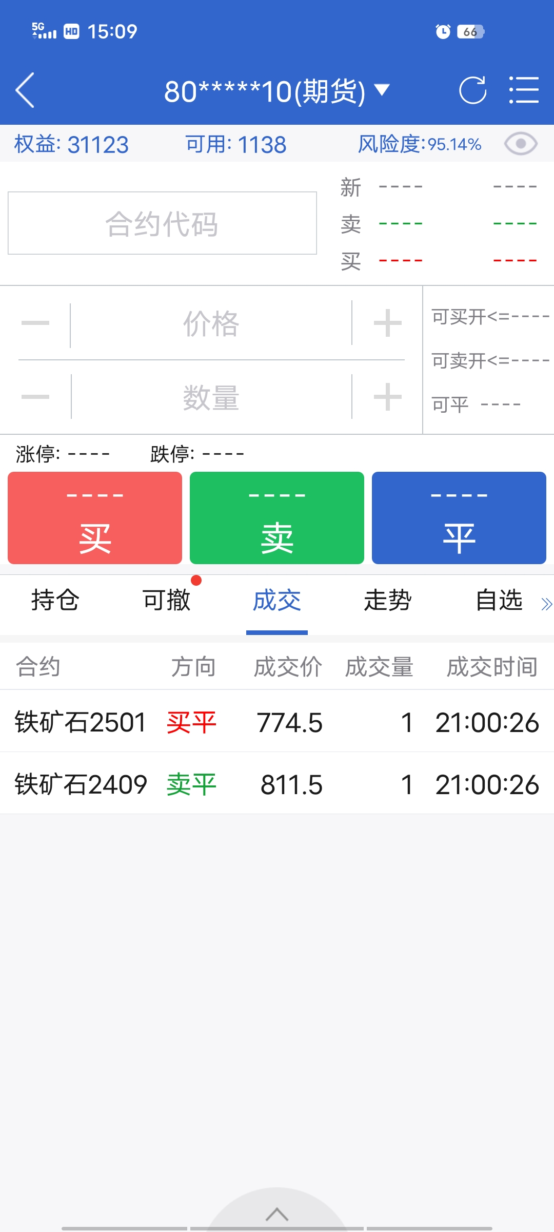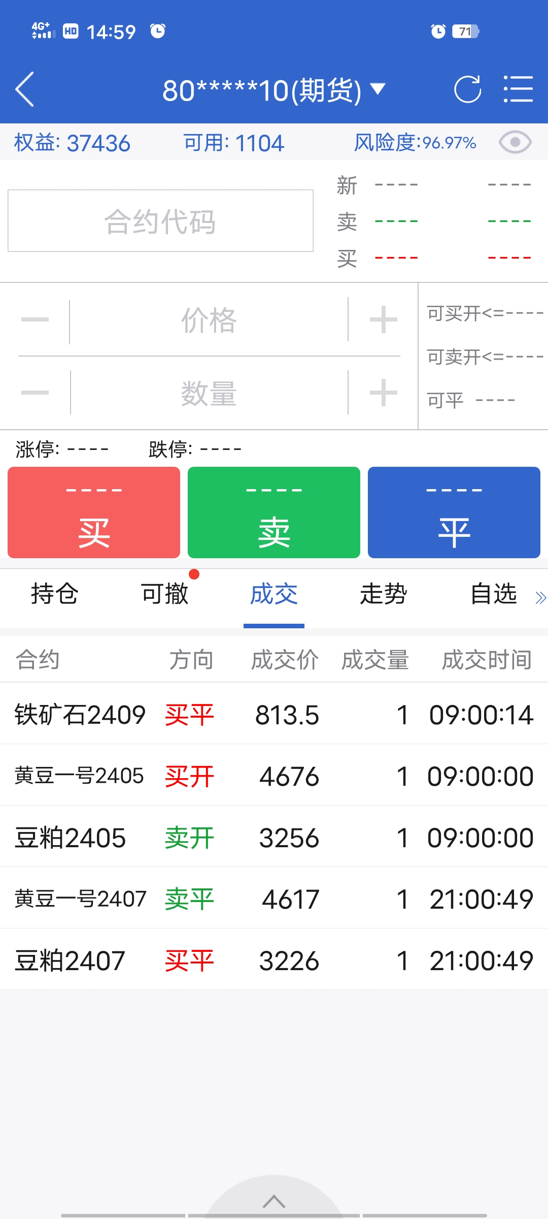期货无交易。挂豆粕套没成交,也好,从亏损到有点小浮盈了。铁表现也不错,差一点成交了,偷笑。如果晚上出局,考虑进一手铁套。铁是永远的神,就是手续费有点贵,特别是套。