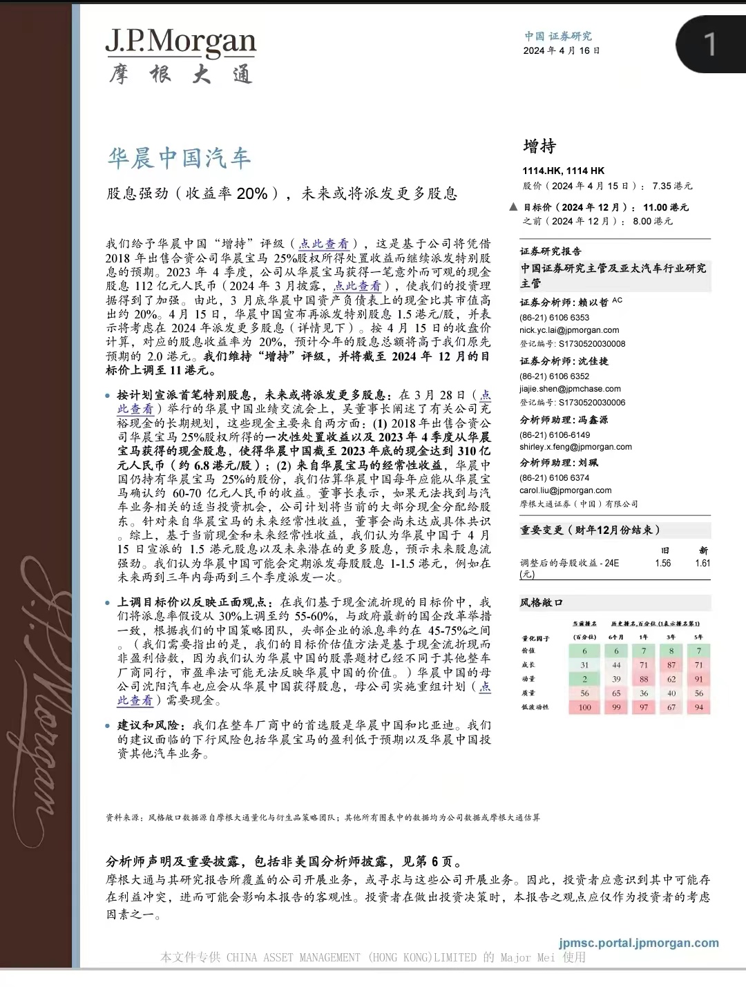 【DB China auto】华晨(1114 HK):宣布派发每股1.5港元股息,创下股息支付者纪录 ** 将目标价上调至12港元 **
